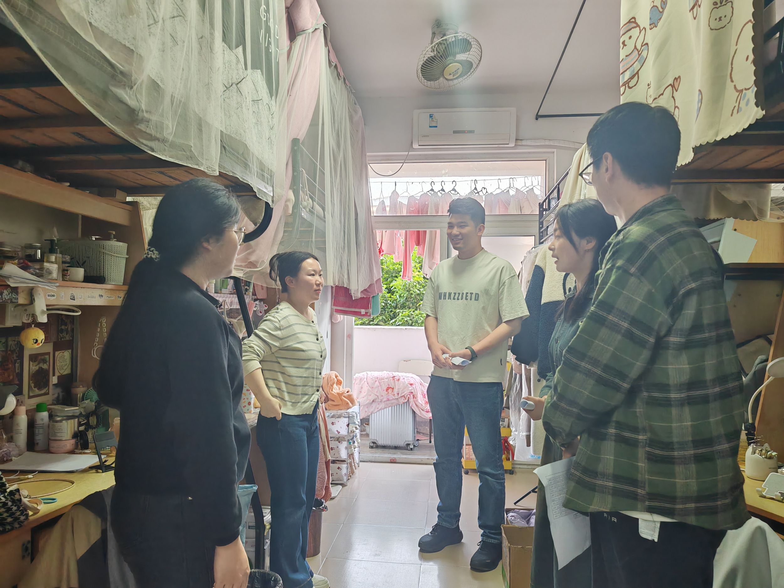常态走访查隐患,织密安全防护网络。各辅导员定期深入各学生宿舍,开展安全隐患排查与卫生检查。走访中,重点检查宿舍电路是否老化、电器是否符合安全标准、消防通道是否畅通等问题,对发现的违规行为当场提醒整改,并建立“隐患台账”跟踪落实;同时,结合宿舍卫生情况,引导学生养成整洁有序的生活习惯,营造“安全、干净、舒适”的居住环境。此外,辅导员还在走访中与学生亲切交流,了解其学习生活困难,将学风引导融入日常沟通,实现“安全排查+学风关怀”的双重效果。