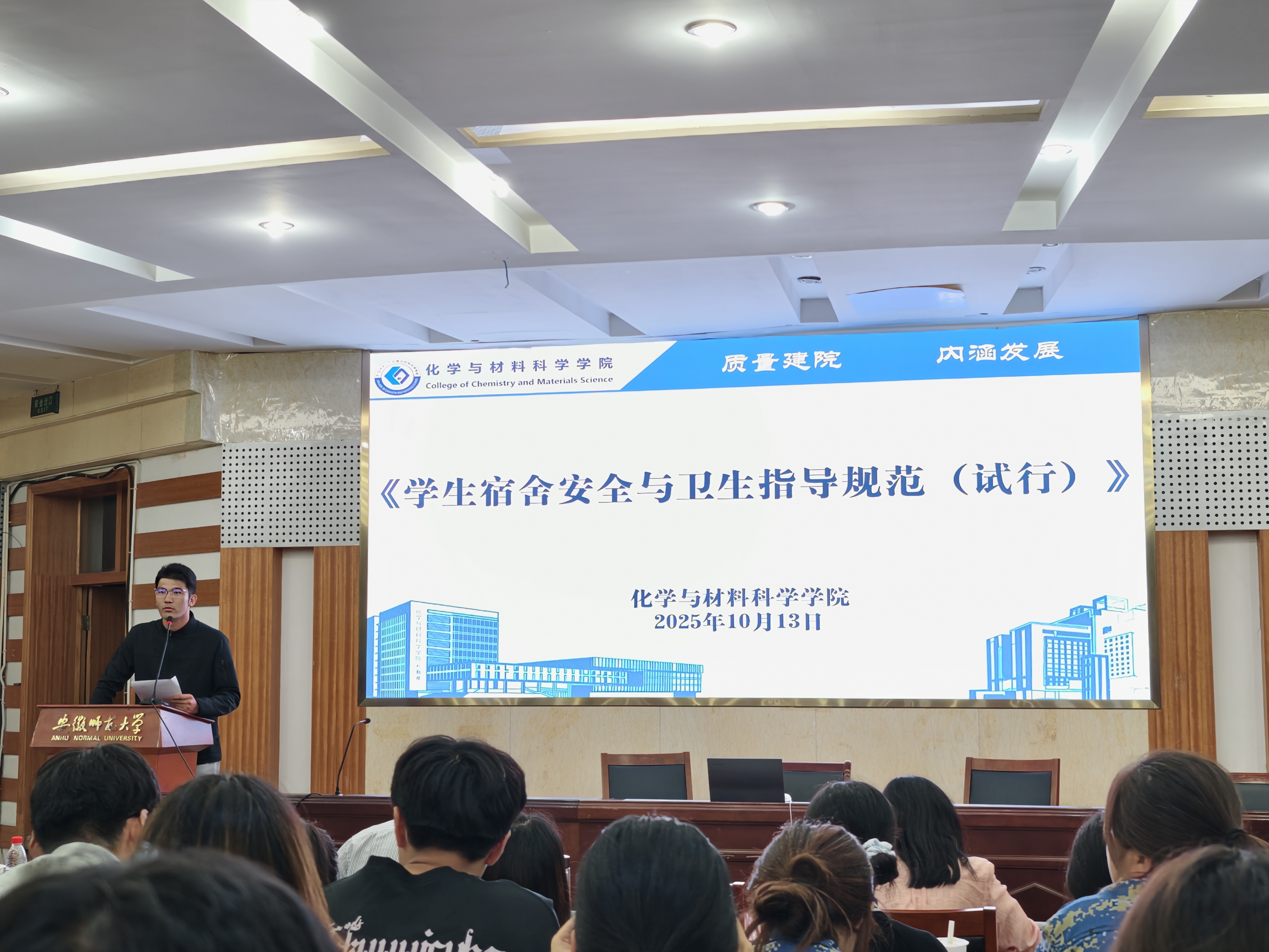 10月13日,学院召开秋季学生宿舍安全教育大会,各年级寝室长、楼层长、学生骨干参会。学院专职辅导员梅冠东以校园真实安全案例为切入点,重申《学生宿舍安全与卫生指导规范》的执行要求:从“杜绝大功率电器”“规范电线摆放”等细节入手,强调安全规范不仅是筑牢校园防线的关键,更是保障学生身心健康、助力学风全域推进的重要一环,让安全意识深入人心。