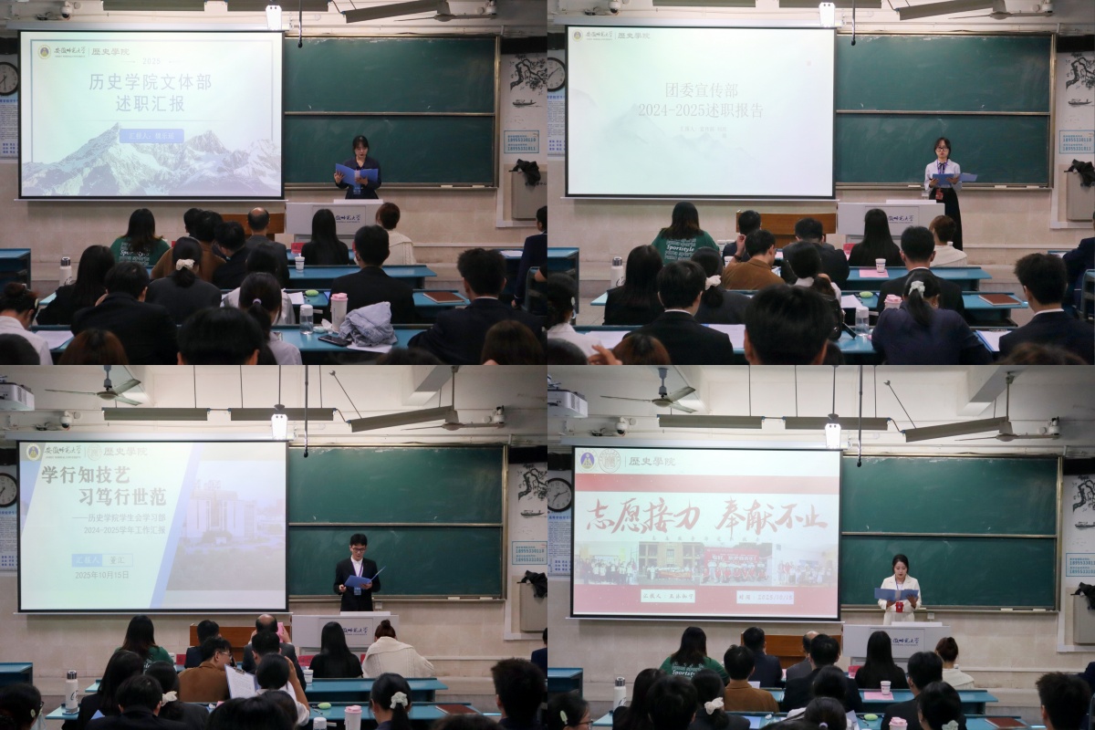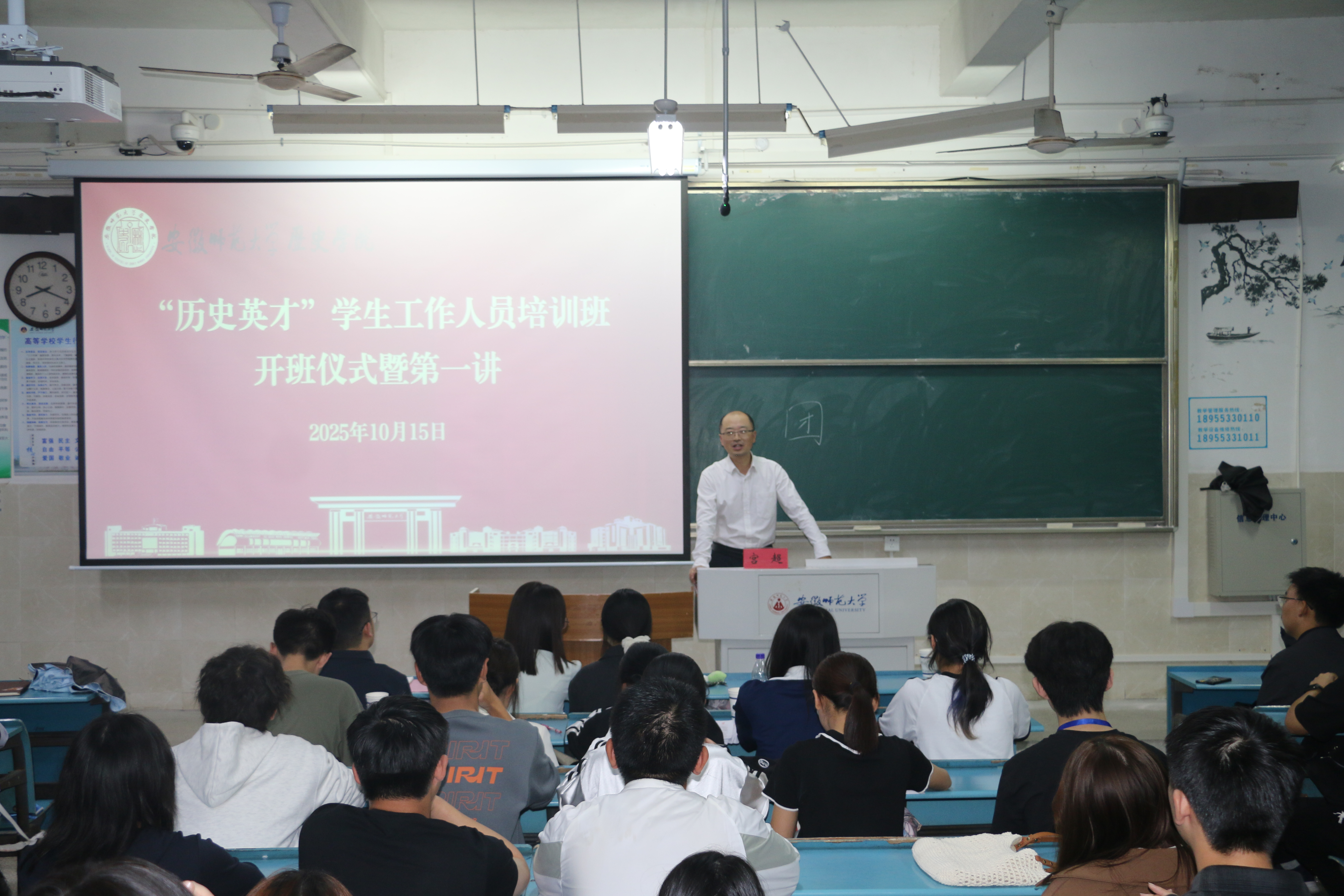 10月15日晚,历史学院在行知楼2010201教室举办了2025-2026学年团委、学生会换届大会暨“历史英才”学生工作人员培训班开班第一讲。院党委副书记宫超,团委书记郭忠尧,辅导员朱晓华、韩雪、周佳妮出席会议,第67、68届团委、学生会全体工作人员及各学生社团、班级负责人参会。