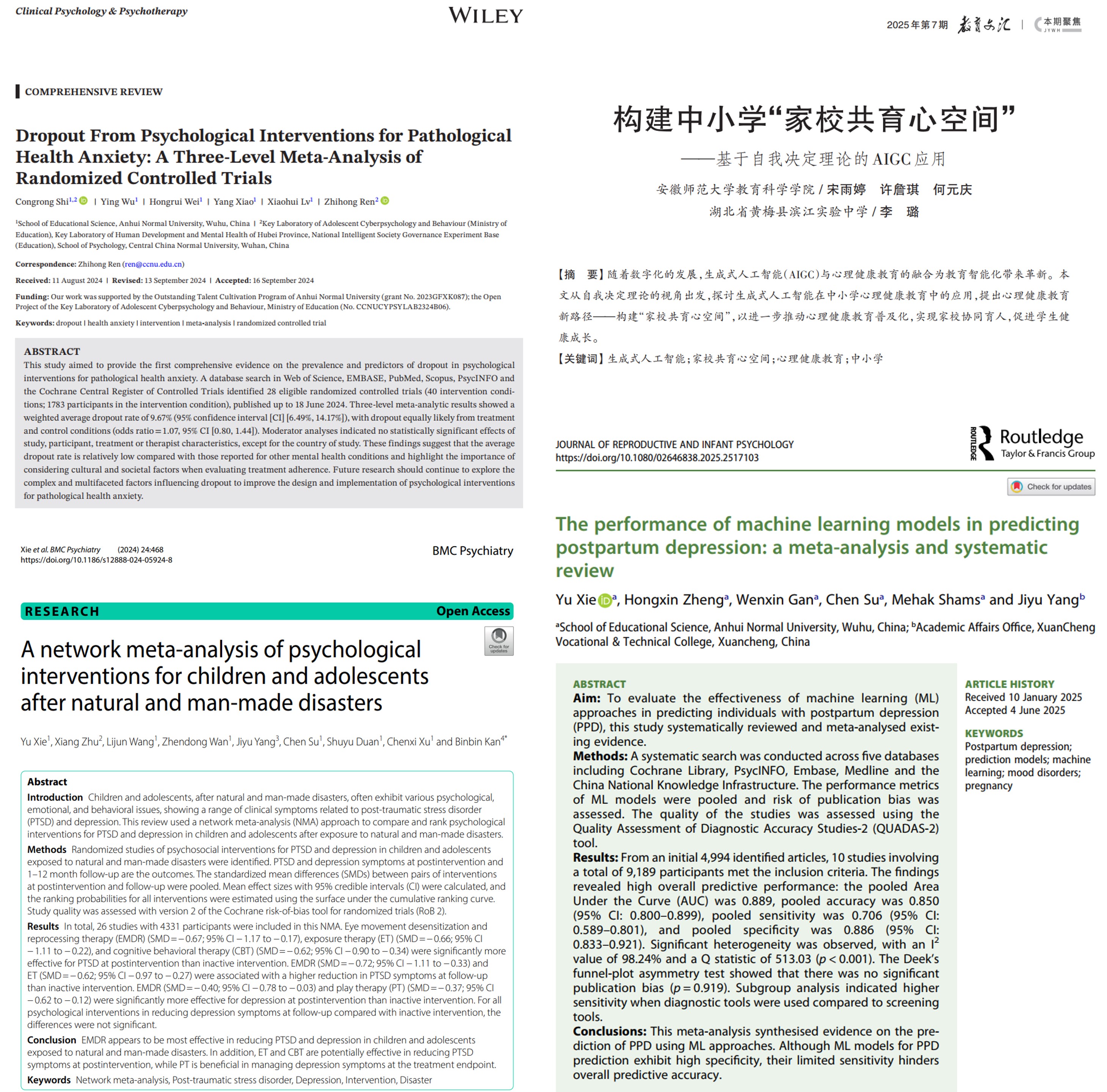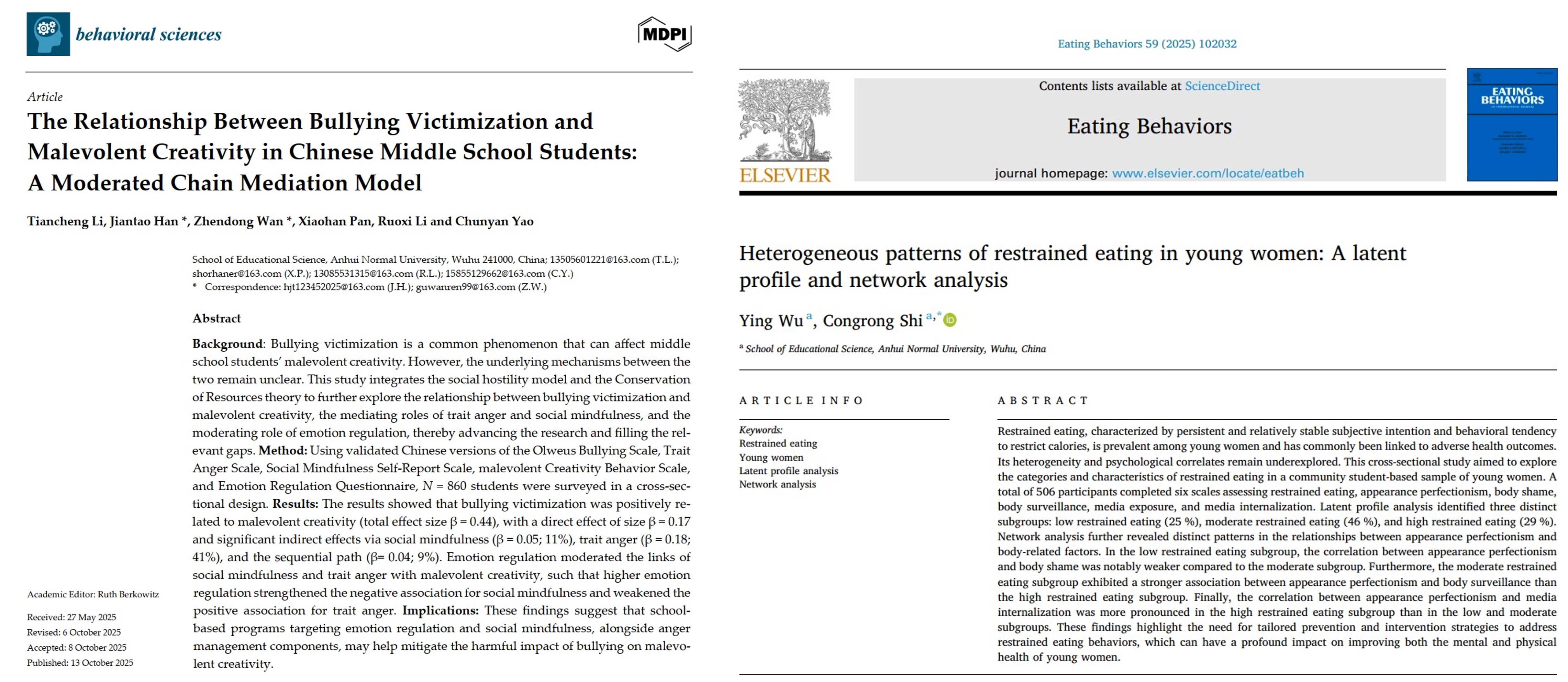 近年来,教育科学学院心理学专业本科生科研素养与创新能力不断提升,多名同学以一作或者参与者身份在国内外权威期刊发表论文,展现出扎实的学科功底和良好的学术潜力。据不完全统计,2022和2023级在读心理学专业本科生共发表学术论文6篇,其中以第一作者身份发表论文2篇,成果质量与数量均创近年新高。其中,2023级本科生李添成同学(指导教师:韩建涛、万振东)以第一作者身份撰写的论文发表于国际权威期刊Behavioral Sciences。该研究采用横断面设计对中国芜湖的860名青少年展开问卷调查,系统考察了霸凌受害与中学生恶性创造力的关系及其机制。2022级本科生伍颖同学(指导教师:史从戎)以第一作者身份撰写的论文发表于国际权威期刊Eating Behaviors。该研究结合潜在剖面分析和网络分析,探索了年轻女性限制性饮食的不同分类及亚组的心理网络。