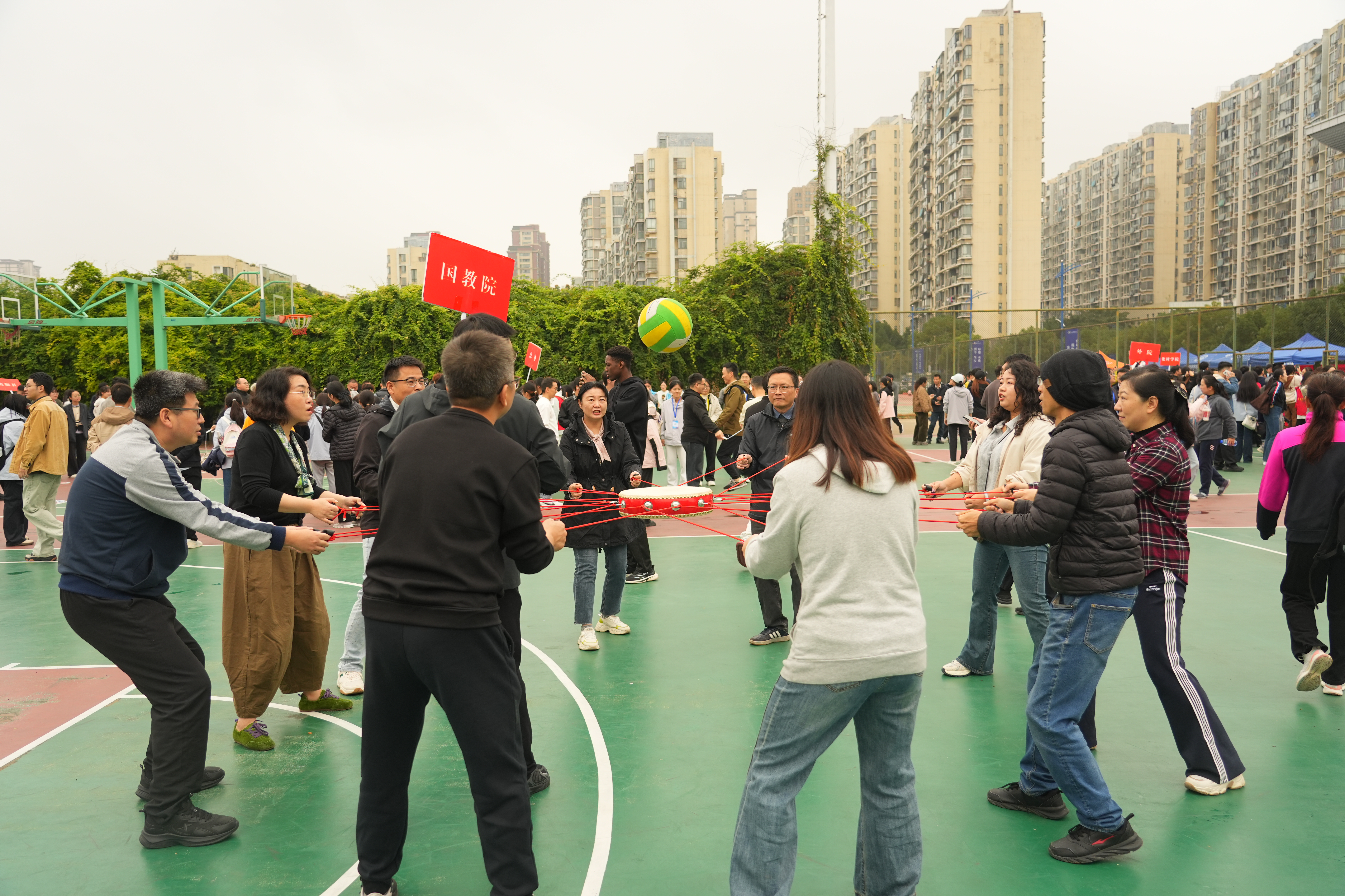工作并肩,运动同欢,在赛场另一隅,教职工趣味运动项目正热烈进行。新闻与传播学院辅导员郭锦怡同时参加了“双人跳绳”和“快乐抖球”两个项目。“在双人跳绳比赛前,我与同伴寻找默契节奏,确定摇绳人选,不断磨合确定方案;在抖球比赛中,我们虽然各自摇球,但成绩是一起计算的,我们都在为了集体荣誉而战斗。”她深有体会地表示,虽然项目形式不同,但团队精神都是制胜关键。在“同心击鼓”项目里,教职工运动员们10人一组,紧盯鼓面上的小球,手臂随着鼓面的起伏灵活调整。外国语学院教师黄朝俊感慨:“这个项目非常考验教师间的相互配合,我们在反复训练中找到了最佳节奏。”