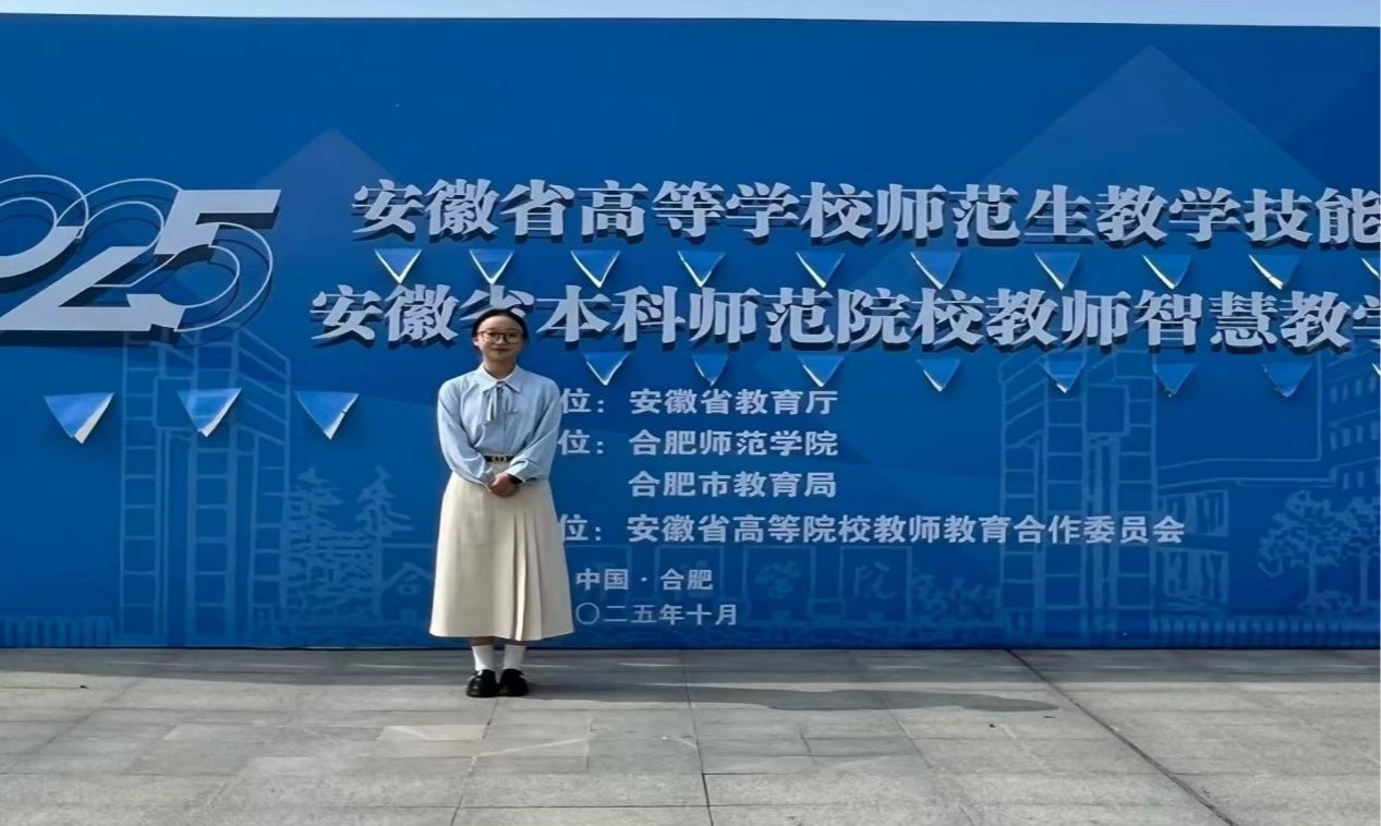 近日,从安徽省高等学校师范生教学技能大赛决赛现场传来喜讯,外国语学院2023级英语(师范)专业学子金子惠凭借扎实的专业功底、精湛的教学设计和出色的现场发挥,从众多参赛者中脱颖而出,荣获大赛中学英语组一等奖,学院教师吕安琪、刘春晓、张琳涛获优秀指导教师称号。