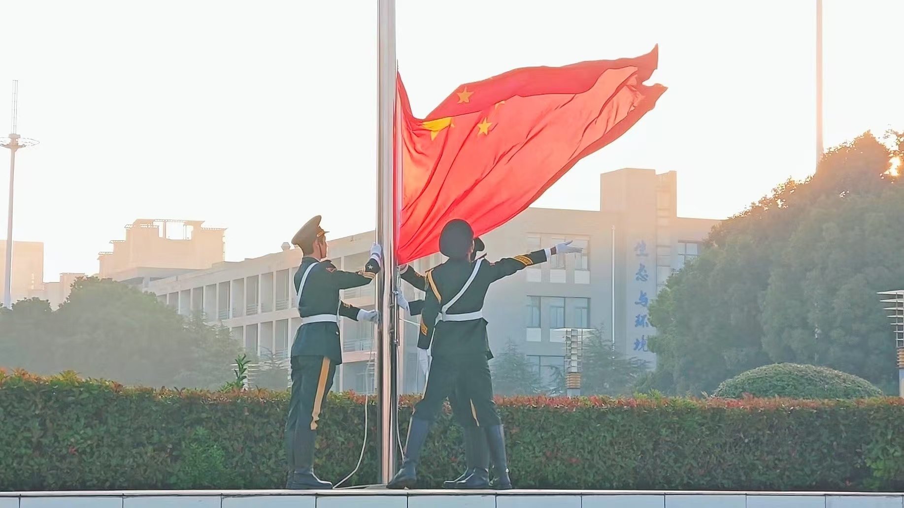 上午7时,伴随着清晨第一缕阳光,学校国旗护卫队的同学们迈着坚实的步伐,护送国旗走向升旗台,在慷慨激昂的国歌声中,鲜艳的五星红旗冉冉升起、迎风飘扬。全体师生深情注视五星红旗,齐唱国歌。