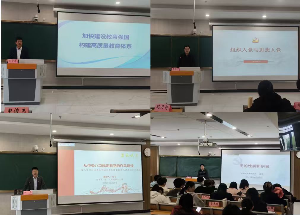 培训期间,一场场精品专题党课接连开讲,构建起“理论+实践+榜样”的立体教学体系。王少仁以《坚定历史自信,增强做中国人的志气、骨气、底气》为题,用鲜活历史案例解读历史自信与“三气”的内在联系;纪委办公室副主任刘飞围绕《从中央八项规定看党的作风建设——深入学习习近平总书记关于加强党的作风建设的重要论述》,系统阐释作风建设的核心内涵与实践路径;正处级组织员蒋学波聚焦《加快建设教育强国,构建高质量教育体系》,深入解读教育强国的特征属性与战略部署;组织部副部长李高举以《组织入党与思想入党》为主题,强调“组织入党一生一次,思想入党一生一世”的深刻内涵;学院党委组织员汪诚详解《党的性质和宗旨》,阐释“两个先锋队”与“全心全意为人民服务”的核心要义,为学员们筑牢信仰之基。
