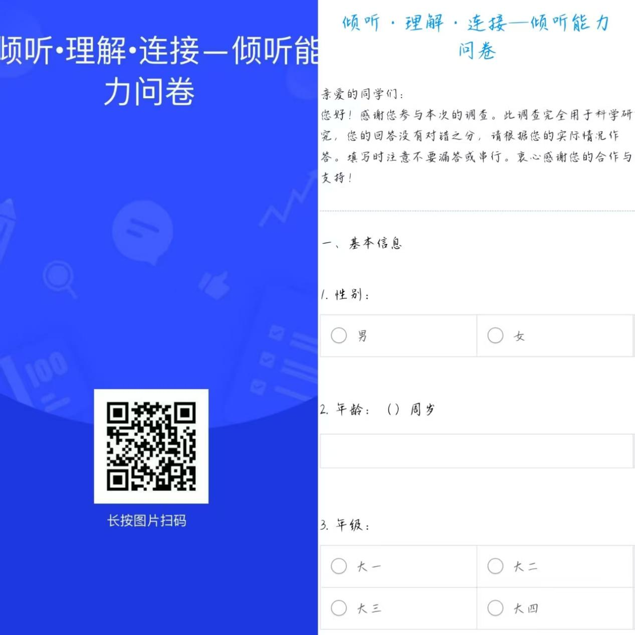 为了精准掌握同学们在日常沟通中的倾听现状,挖掘影响有效倾听的关键因素,收集调查对象对“倾听能力提升”的实际需求,通过填写(大学生关于倾听的调查问卷)心理调查问卷,帮助大家了解自己的沟通习惯,慢慢意识到“倾听”的重要性。