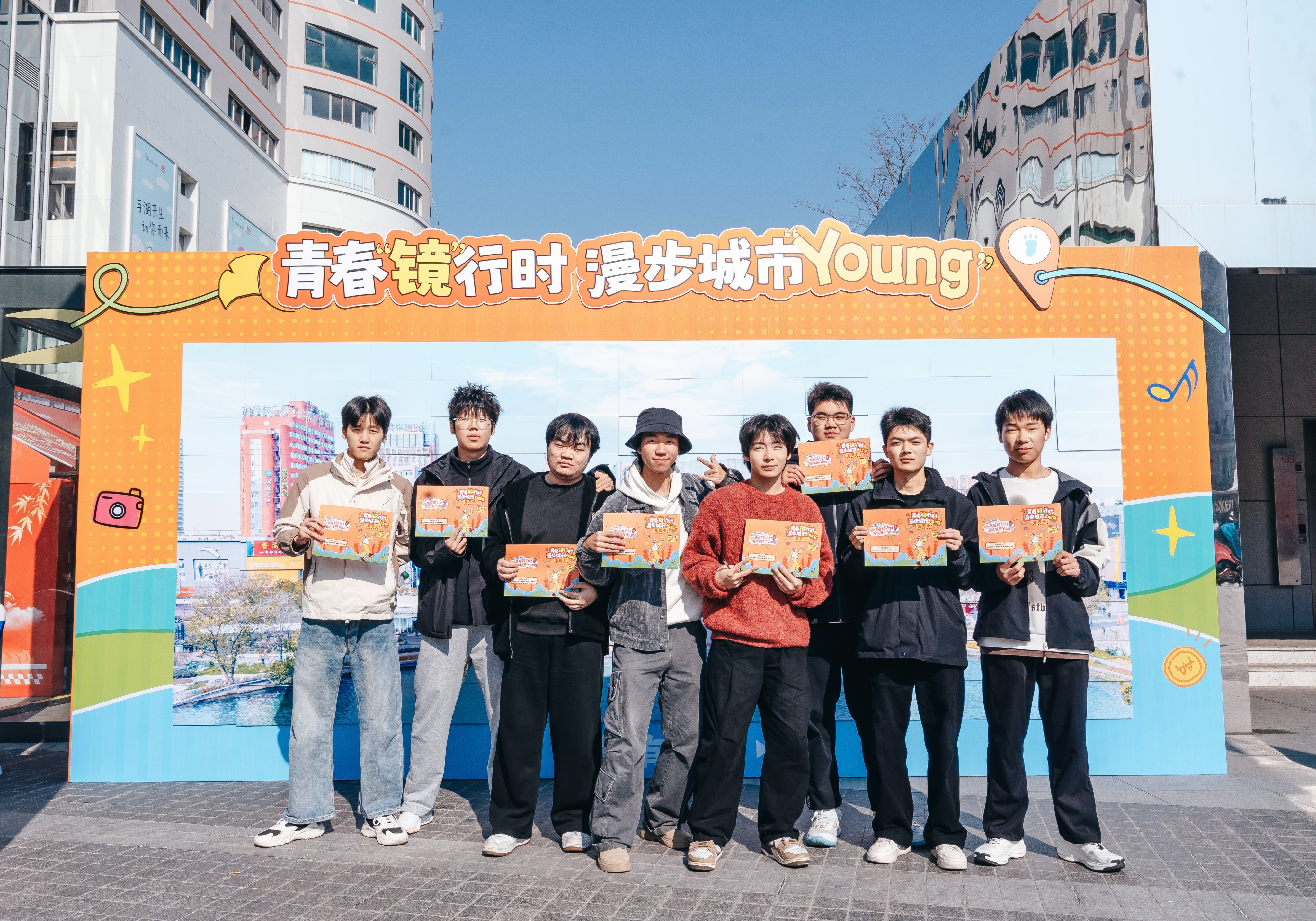 活动伊始,同学们领取专属“集章卡”,开启趣味打卡之旅。现场设置【潮玩福利社】、【青春活力带】、【美食能量站】、【青年拼图墙】等多个主题区域打卡点,同学们纷纷前往互动区进行挑战。一块块拼图在大学生们手中汇聚,逐渐勾勒出青春与城市交融的美好蓝图,中山路步行街上青年学子的身影展现着城市的蓬勃朝气。