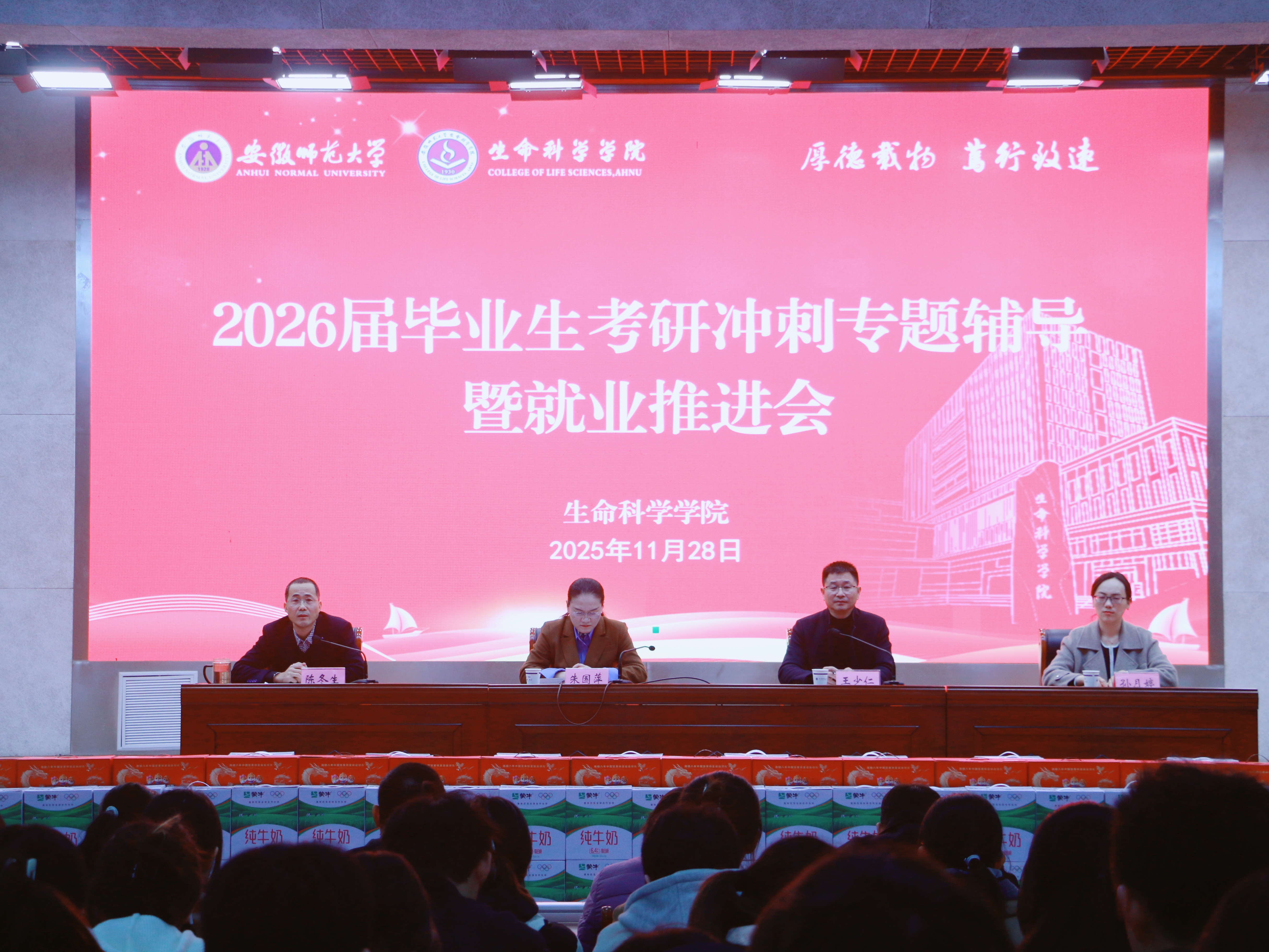 为全面推进2026届毕业生就业工作,助力考研学子坚定信心、缓解备考压力,11月28日,生命科学学院于花津校区实习实训中心一楼报告厅召开2026届毕业生考研冲刺专题辅导暨就业推进会。生命科学学院长朱国萍、党委副书记孙月婷、教学副院长陈冬生、专业负责人代表、毕业班辅导员及全体毕业生参加会议,会议由学院党委书记王少仁主持。