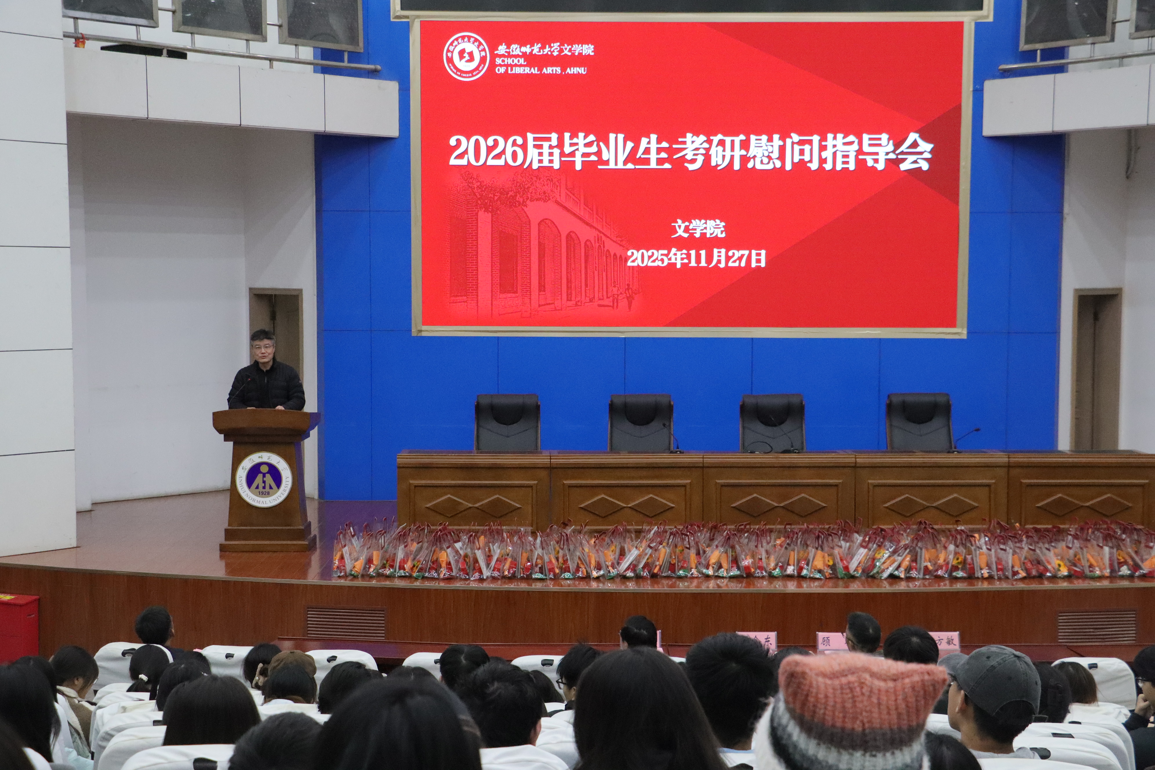 11月27日,文学院在敬文图书馆报告厅召开2026届毕业生考研慰问指导会。文学院党委书记顾凌、院长项念东、党委副书记左方敏、副院长胡承佼,全体毕业班辅导员及2026届全体毕业生参会。会议由左方敏主持。
