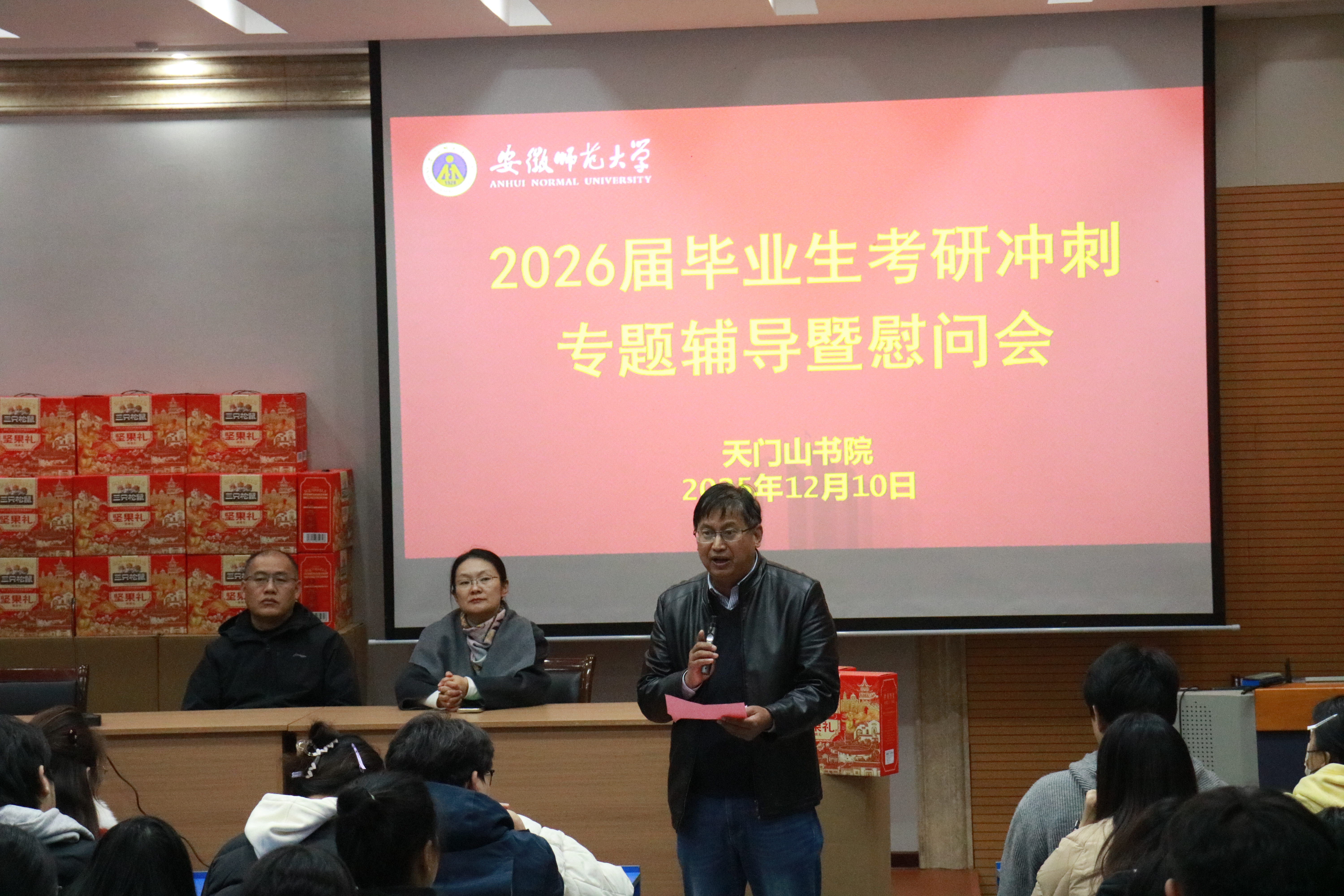 12月10日中午,天门山书院(未来技术学院)在天门山校区图书馆报告厅召开2026届毕业生考研冲刺专题辅导暨慰问会。书院党政领导班子全体成员及24级全体辅导员出席会议,为备战考研的学子们送上深切关怀与全力支持。