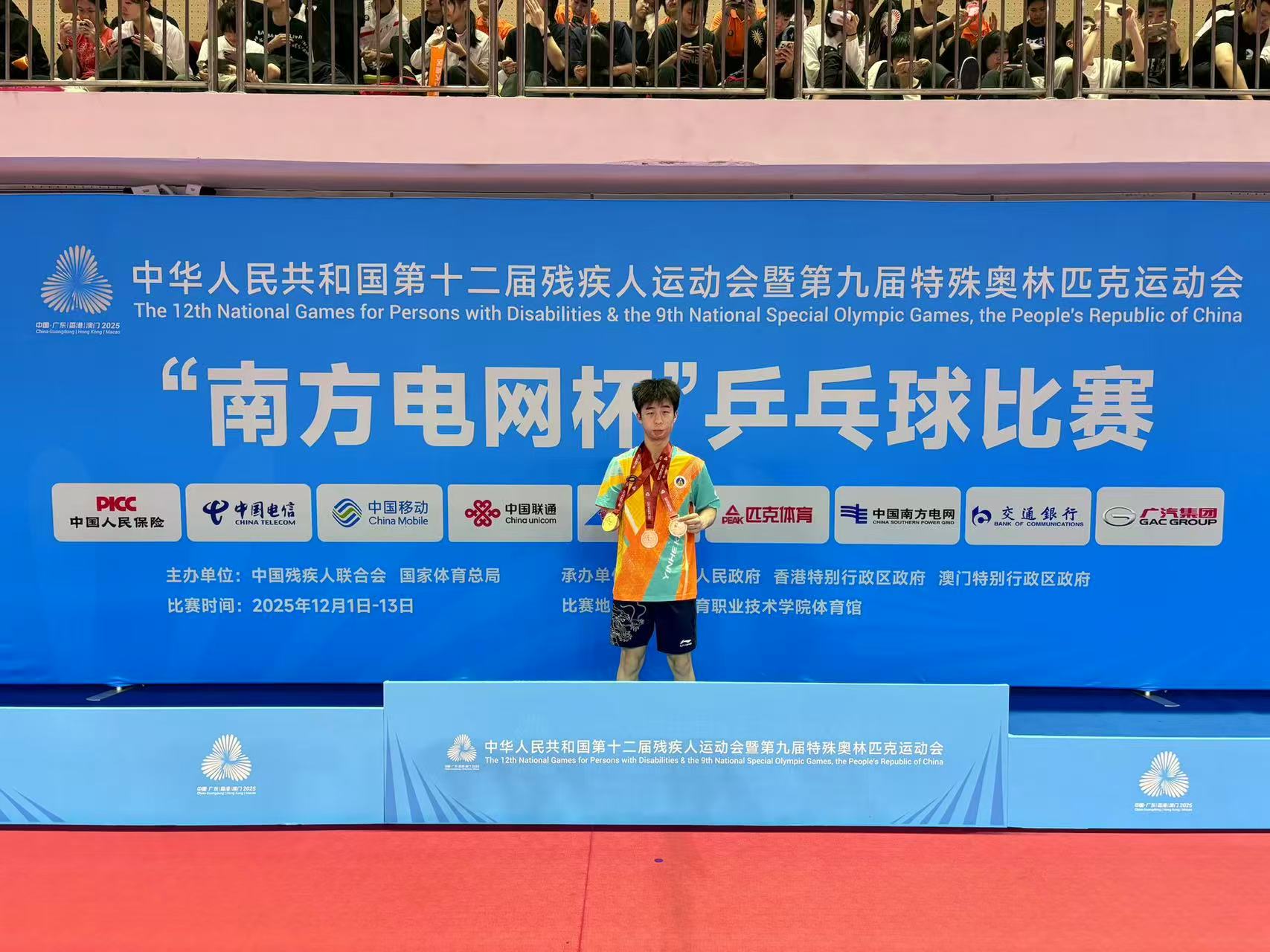 12月5日,中华人民共和国第十二届残疾人运动会暨第九届特殊奥林匹克运动会“南方电网杯”乒乓球比赛在广州开赛。赛事汇集了全国31支代表队的318名运动员同场竞技。我校体育学院2023级运动训练专业学生胡润涛奋勇拼搏,凭借精湛技艺,最终荣获混双冠军、男团季军、男双季军及男单第四名的优异成绩,充分展现了师大学子的卓越风采。