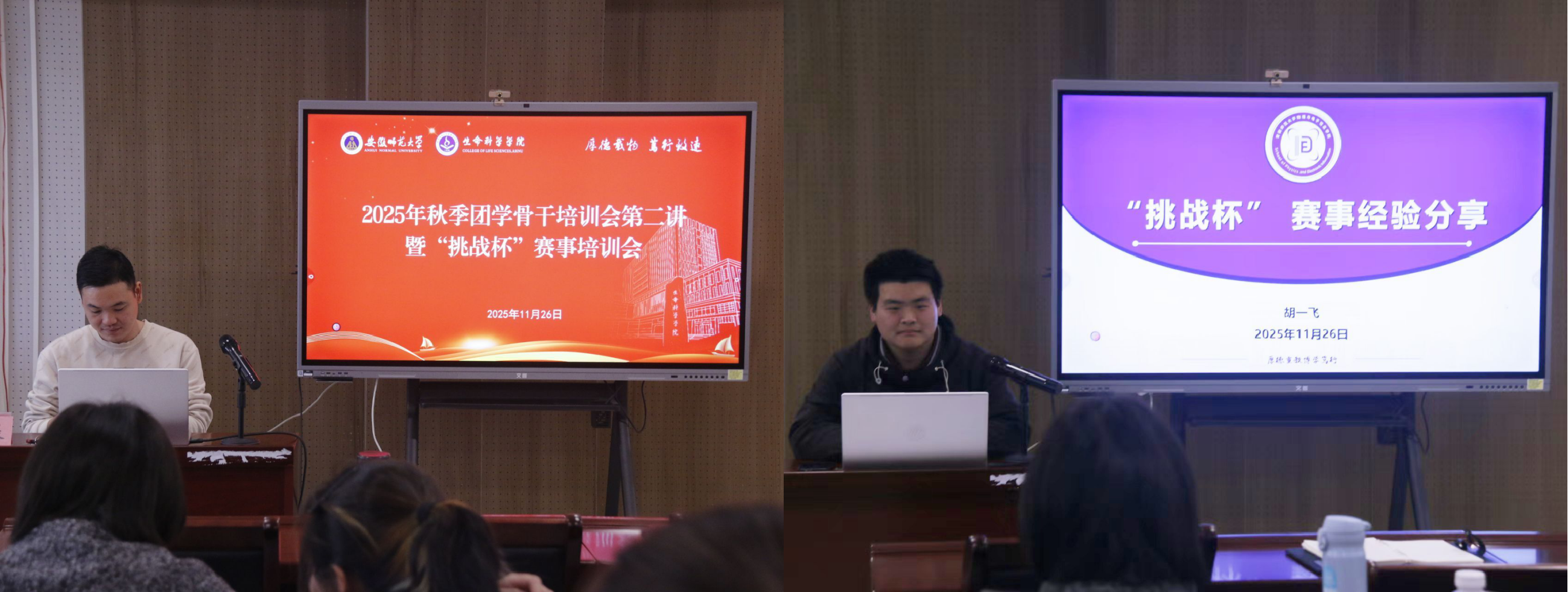 培训课程第三讲,校团委素质拓展部部长王申振老师、第十九届“挑战杯”竞赛全国特等奖团队负责人胡一飞应邀开展“挑战杯”系列赛事经验分享。王申振围绕“挑战杯”赛事规则与“科技创新和未来产业”赛道布局,分享了优秀的项目案例,为学员梳理选题方向、备赛路径与材料撰写要点。胡一飞以ARG研究项目为例,拆解作品“创新意义”的撰写逻辑,结合学院团学工作实例,讲解活动“策划—执行—复盘”的全流程方法,助力骨干提升工作实操效率与组织协同能力。