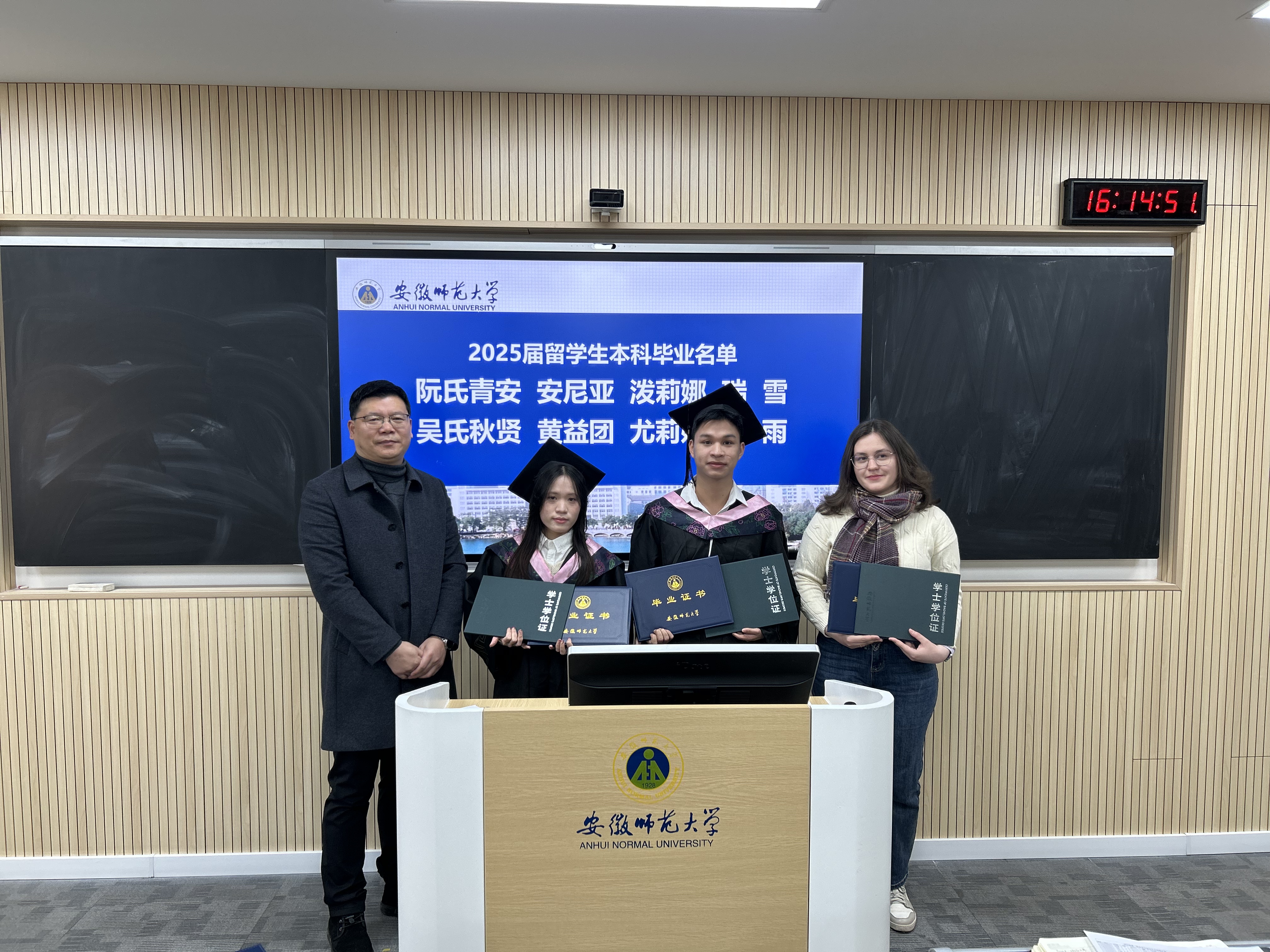 欢送会上,方芳首先宣读了2025届第二批留学生毕业与结业名单,逐一介绍了即将踏上新旅程的学子们。随后,与会领导为毕业生和结业生颁发了证书,并与每位学生亲切握手、合影。来自越南的毕业留学生代表吴氏秋贤在发言中回顾了在校学习的美好时光,表达了对母校和老师们的深深感谢。她表示,在学校的学习生活不仅丰富了知识,也拓宽了国际视野,这段经历将成为人生中宝贵的财富。教师代表郑甲申在随后的发言中勉励他们在未来的工作和生活中继续发扬“厚德、重教、博学、笃行”的校训精神,在各自的领域开拓创新,成就一番事业,为世界进步贡献力量。