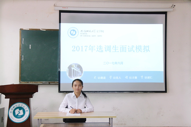 本网讯(文学院)6月9日下午,由安徽省干部培训高校基地(安徽师范大学)、党委组织部主办,文学院承办的2017年选调生模拟面试在学院行政楼二楼会议室成功举办。文学院党委书记余大芹担任主考官,历史与社会学院党委书记顾凌,学校办公室副主任张伟,文学院党委副书记戴和圣,副教授李定乾,学校办公室机要科科长吴青山,党委组织部干部科科长黄友生应邀担任模拟面试考官。来自文学、政治、法学、经管、历社、外语学院的10位选调生笔试入围考生参加模拟面试,20多位备战2018年选调生考试的同学现场观摩学习。