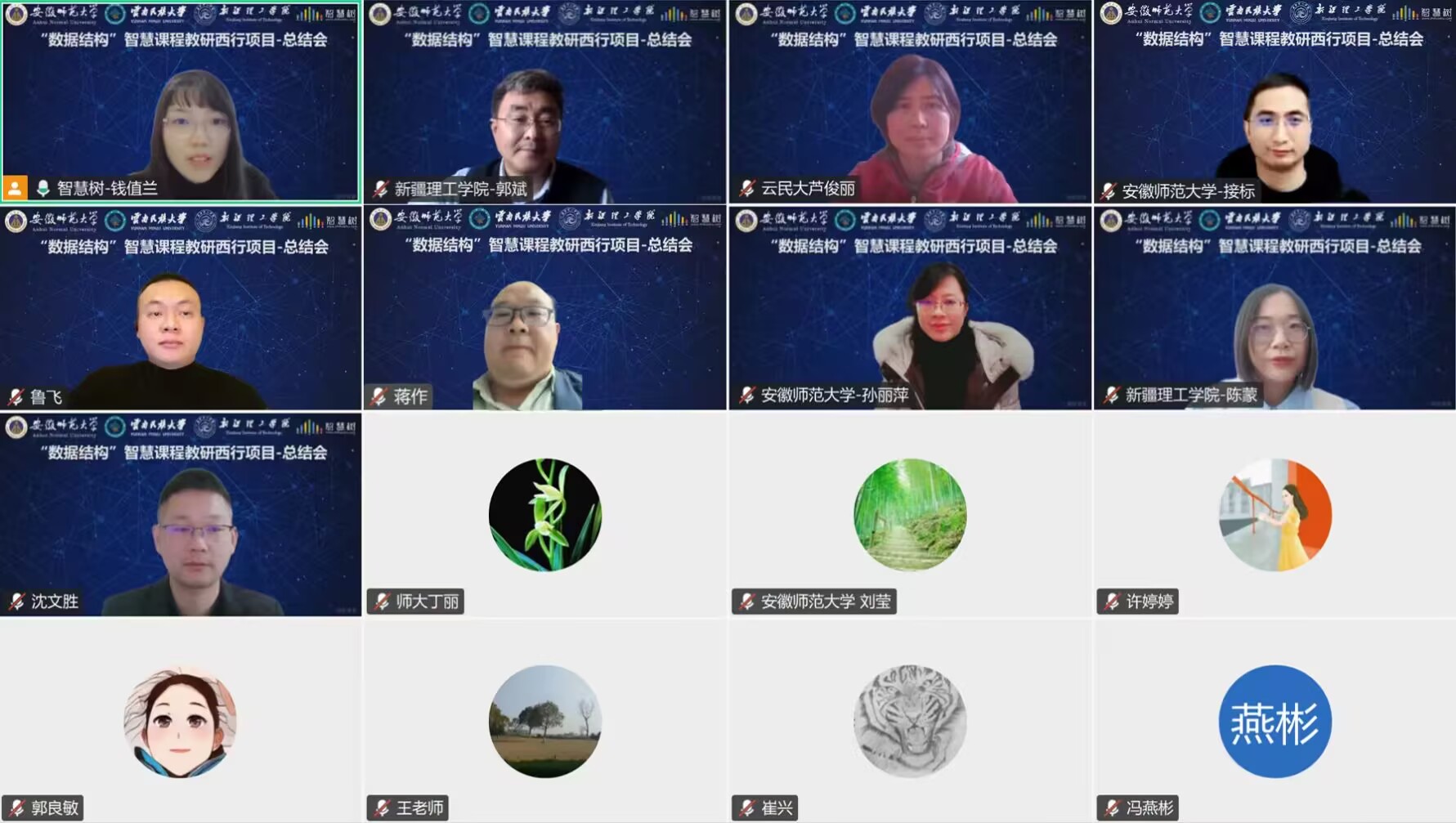 1月27日,安徽师范大学、云南民族大学与新疆理工学院联合召开“数据结构”智慧课程教研西行项目线上总结会。安徽师范大学计算机与信息学院院长接标、副院长孙丽萍,云南民族大学数学与计算机科学学院副院长蒋作、副教授芦俊丽,新疆理工学院信息工程学院副院长郭斌、副教授陈蒙、教师沈文胜,智慧树网安徽省区经营单元负责人鲁飞及其他老师参加了此次总结会。