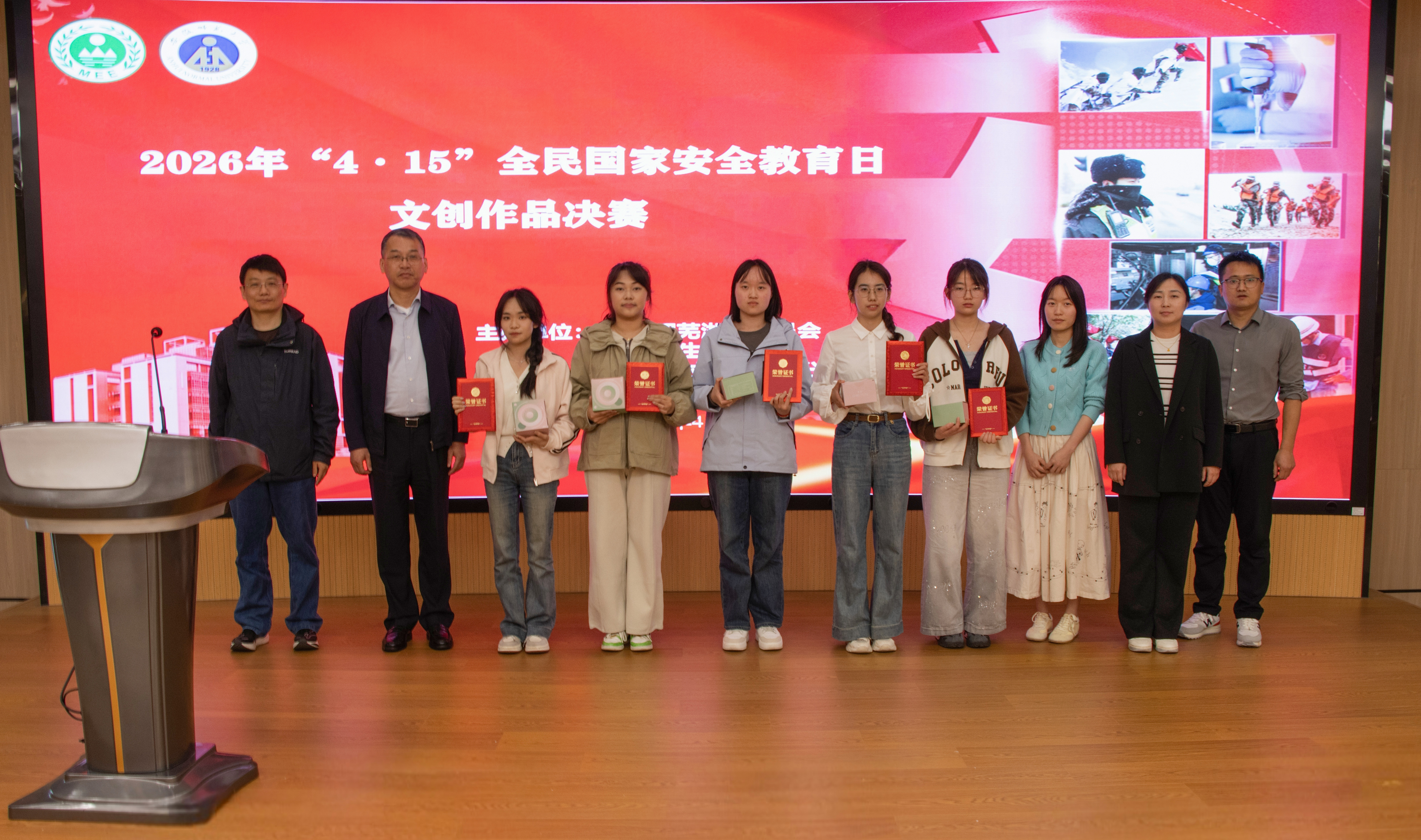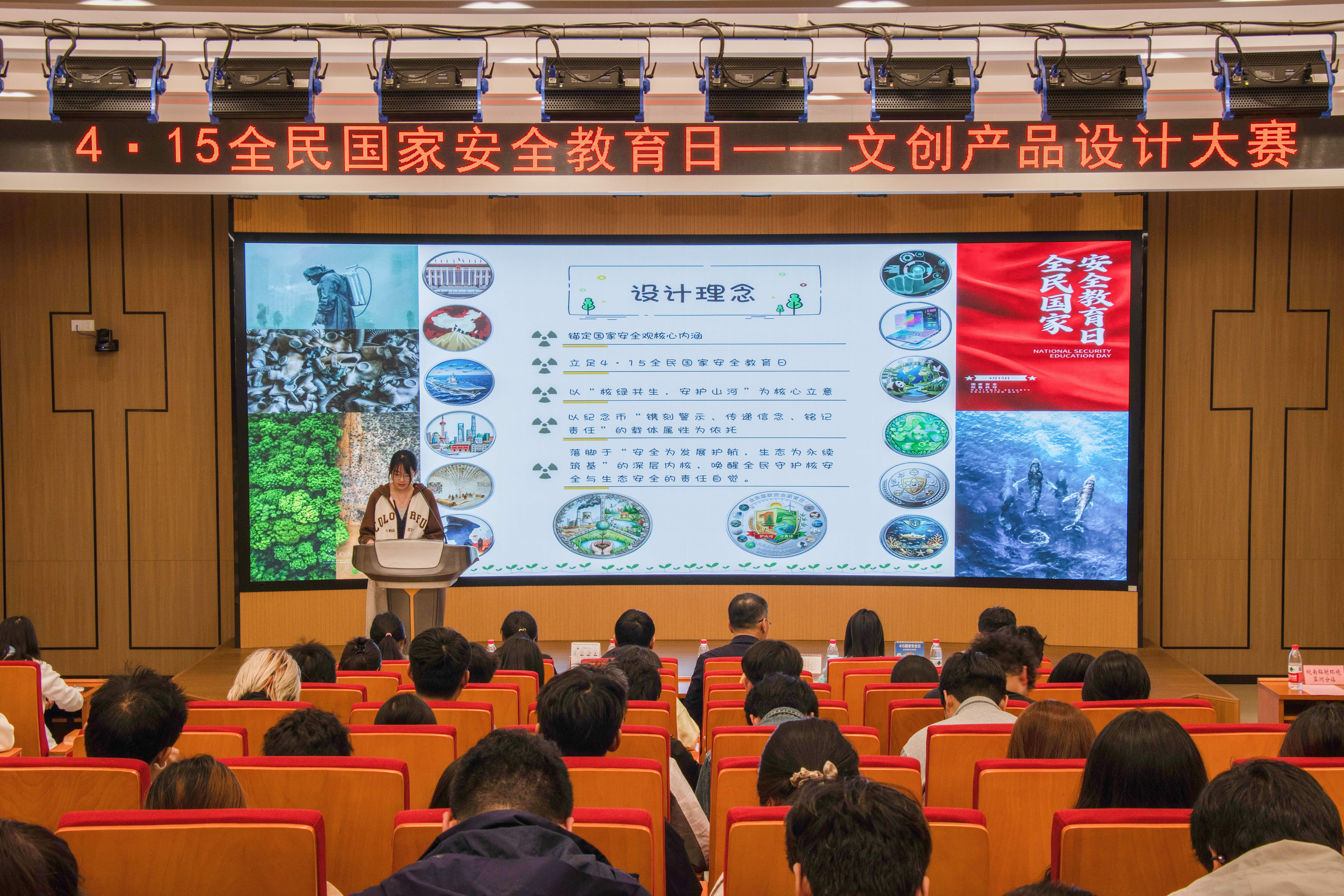 本次大赛共有全校210名同学参与,征集到95件作品,历经初赛、复赛,来自4个学院的10件作品进入决赛。各参赛团队以国家安全为主题,围绕核安全、生态安全、辐射安全等方面,依次登台展示设计理念与作品内涵。最终2024级环境工程(卓越工程师班)陶丽雯的《安核·护生》等2组作品荣获一等奖;2025级视觉传达设计匡娱娜的《安全守护家》等3组作品荣获二等奖;2024级生态学专业夏雨佳的《国家安全金属纪念币》等5组作品荣获三等奖。与会领导向获奖选手颁发了证书和奖品并合影留念。颁奖式上,全体人员共同观看了国家安全专题宣传片与学校国家安全科普志愿队活动视频,进一步深化了对总体国家安全观的理解与认同。