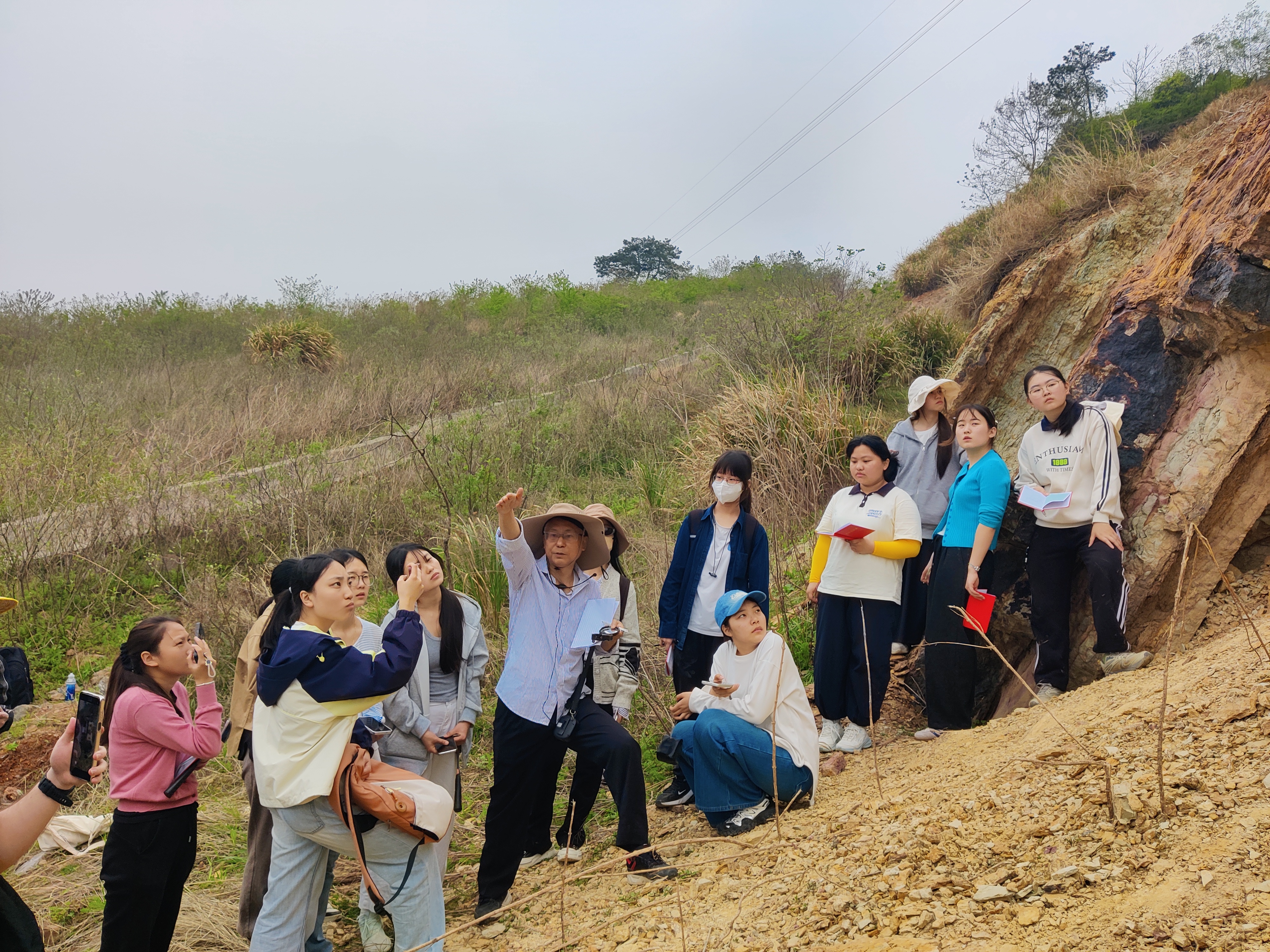 在7410工厂教学点(中国人民解放军第7410工厂),开展沉浸式国防思政教育。指导教师向同学讲述工厂扎根巢湖、服务国防的创业故事,感悟几代军工人“国家利益至上、质量就是生命”的坚守与奉献。从大地构造到国防装备,从地质报国到军工强国,同学们在实景感悟中深刻理解:守护大好河山,既要读懂地球密码,更要筑牢国家安全屏障,家国情怀在军工精神与地质使命的交融中愈发坚定。在鹅头岩教学点,师生们沿着崎岖山径攀登,直面亿万年地壳运动造就的逆冲断层奇观。实习指导教师现场讲解断层构造与区域地质安全、防灾减灾、工程建设的密切关联,引导学生从岩石纹理读懂大地密码,从地质变迁感悟山河壮丽。大家围坐岩下,对照擦痕走向判断断层性质,绘制构造素描,在实景教学中把专业知识与国土安全、生态保护紧密相连,爱国情怀在地质探索中自然升华。