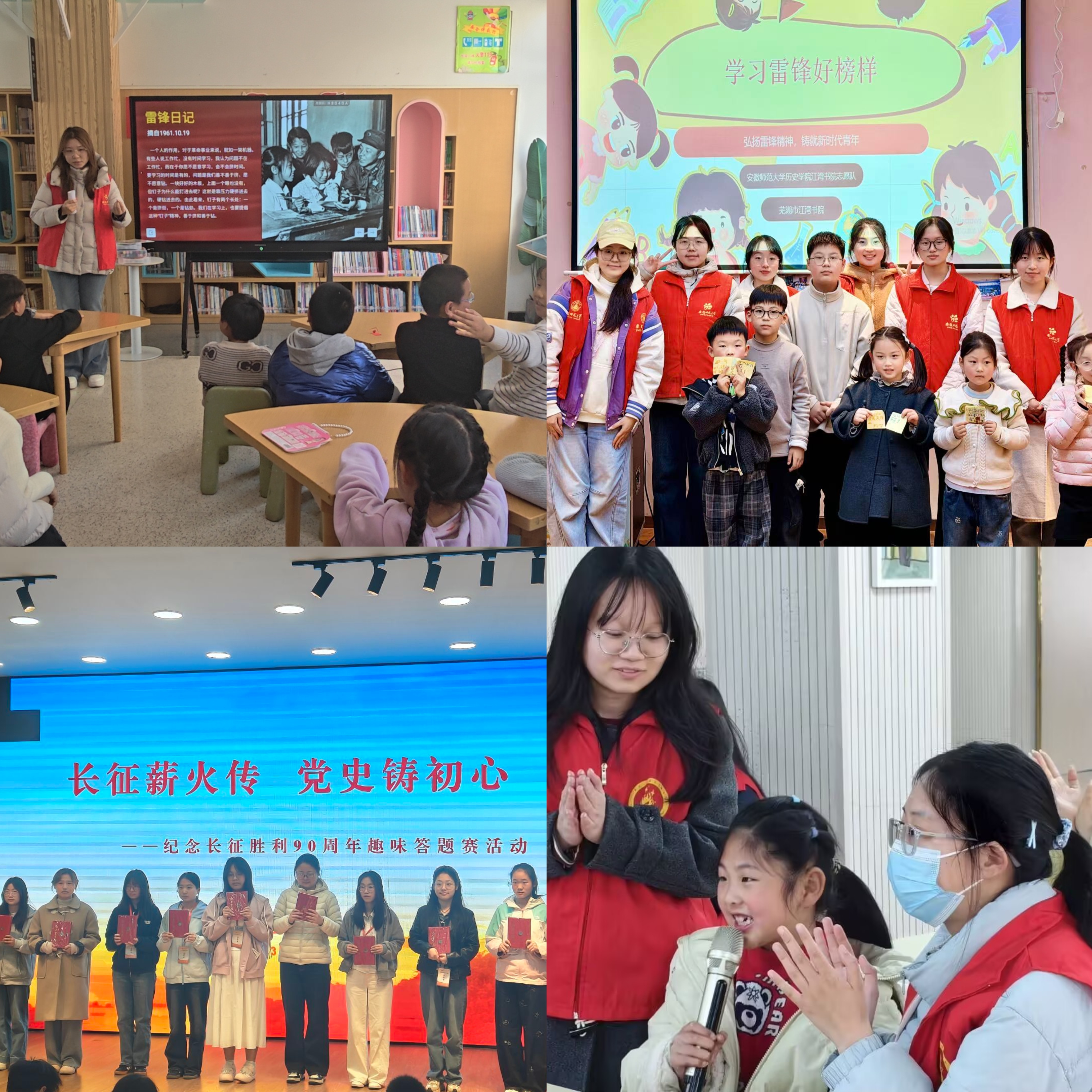学院以传承弘扬雷锋精神为主线,整合多支特色志愿团队资源,构建起理论宣讲、文化传承、社会关爱三位一体的立体化服务矩阵,让学雷锋志愿服务活动精准对接社会需求、深度融入日常实践。新青年志愿队走进芜湖市名人馆、花津书苑,以沉浸式讲解和互动分享,让雷锋精神更接地气、深入人心。“繁星·春水”江湾书院志愿队扎根江湾书院,持续开展宣讲等系列主题活动。南瑞社区志愿队策划“触摸历史·童心传承”主题活动,通过历史文化宣讲,在青少年心中播撒爱国与奉献的种子。王稼祥纪念园志愿讲解队结合长征胜利90周年这一时间节点,以“长征薪火传,党史铸初心”趣味答题赛,生动再现革命先辈的奋斗足迹。研究生“青研有为”志愿队联合“微芒故事妈妈团”,打造“简明历史小课堂”,开发历史启蒙绘本课程,以通俗易懂的方式弘扬中华优秀传统文化。“薪火·星望”志愿队持续关注孤独症儿童群体,依托音乐疗愈、手作工坊等定制化服务,用专业与温情传递社会关爱。“桃李·繁林”白马书院志愿队开展“童心学榜样,薪火永相传”主题活动。系列活动打破时间局限,形成“月月有主题、周周见行动”的“日常+暑期+寒假”常态化志愿服务格局。