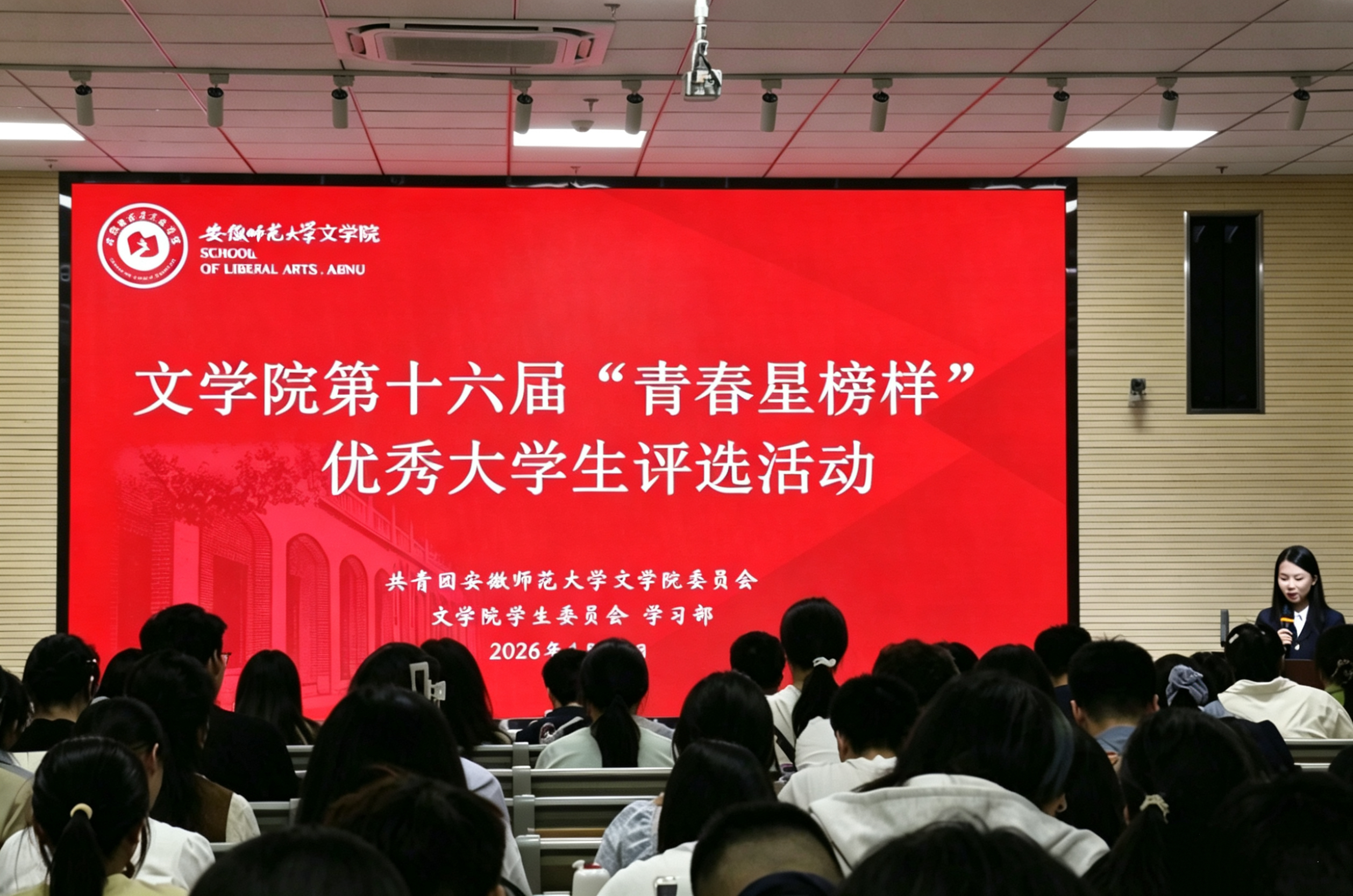 4月9日晚,安徽师范大学文学院第十六届“青春星榜样”优秀大学生评选汇报会在文典楼F108教室举行。文学院党委副书记左方敏老师、各年级辅导员老师担任评委,各年级学生代表到场参与。本次活动旨在展现学子昂扬向上的精神风貌,营造勤学善思、笃行致远的学院氛围,树立德才兼备的学生典型,激励广大同学奋发有为、全面发展。