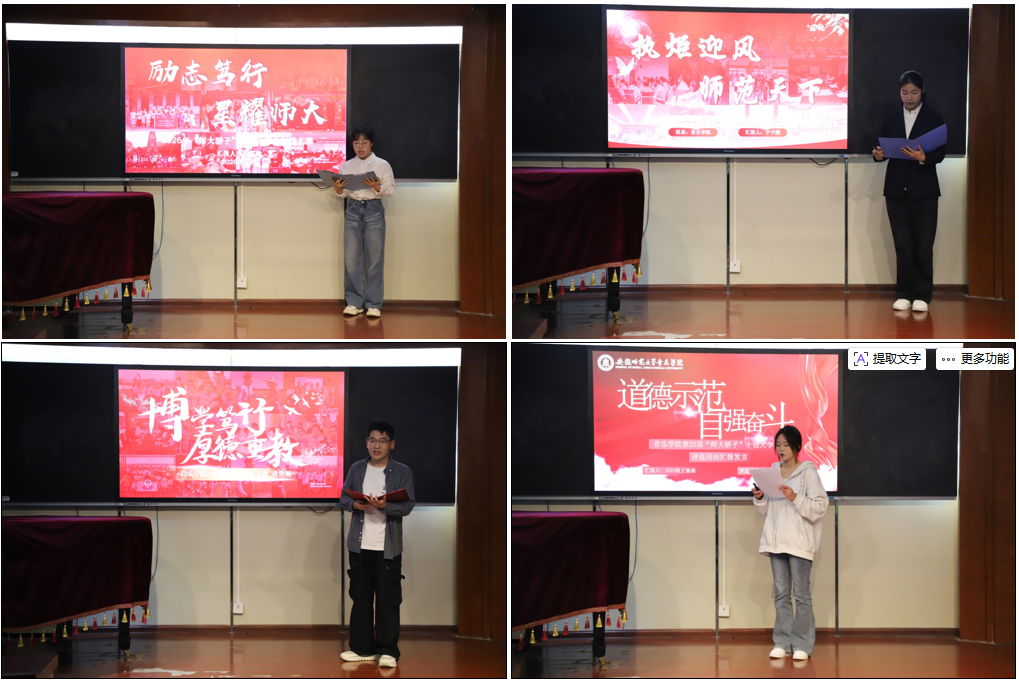 21位汇报人采用PPT演示汇报形式,围绕“道德示范与自强奋斗”“科技创新与自主创业”“社会实践与志愿服务”“文艺创作与体育锻炼”“学风创优与绿色发展”五个类别,结合自身学习、思想、工作、实践等经历与成果进行汇报,展示了音乐学院学子向善向上的精神状态和能吃苦、肯奋斗的拼搏精神与青春风采。