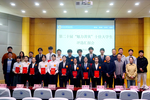 汇报结束后,陈刚锋作总结讲话。他充分肯定了各汇报人的成绩,希望全体同学能够以优秀榜样为指引,坚守理想信念,锚定奋斗目标,对标先进典型。在今后的学习实践中,持续深耕专业领域,着力提升综合素养,通过知识积累与实践历练,实现专业能力与综合素质的协同发展,努力成长为适应新时代发展需求的复合型商科英才。经现场评选,2022级供应链管理专业孙玉婷、2023级会计学1班陈祉含等十名同学荣获学院“魅力菁英”十佳大学生称号,2024级金融工程专业施雪莹、2024级供应链管理专业周缘等五名同学荣获学院“魅力菁英”优秀大学生称号。