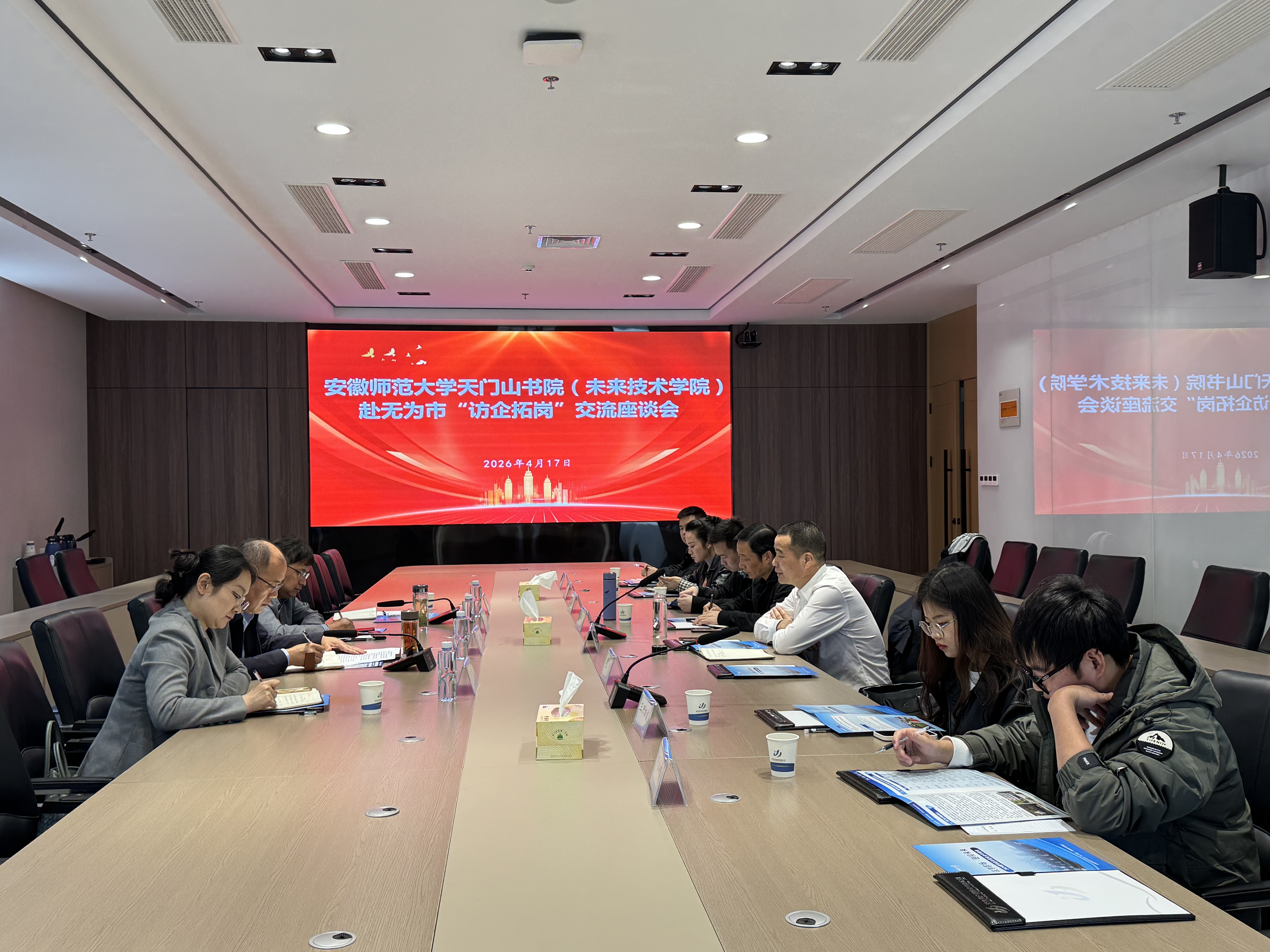 为深入贯彻落实高校毕业生就业工作部署,深化校地、校企合作,精准对接企业人才需求,拓宽毕业生就业渠道,4月17日上午,天门山书院(未来技术学院)党委书记罗振、院长商永嘉率队赴无为市开展访企拓岗专项交流活动。无为市委组织部副部长(兼)、人社局党组书记、局长赵帮俊,人社局党组成员、副局长刘昌江,人才综合服务中心主任潘晓东等参与接待了对接交流。