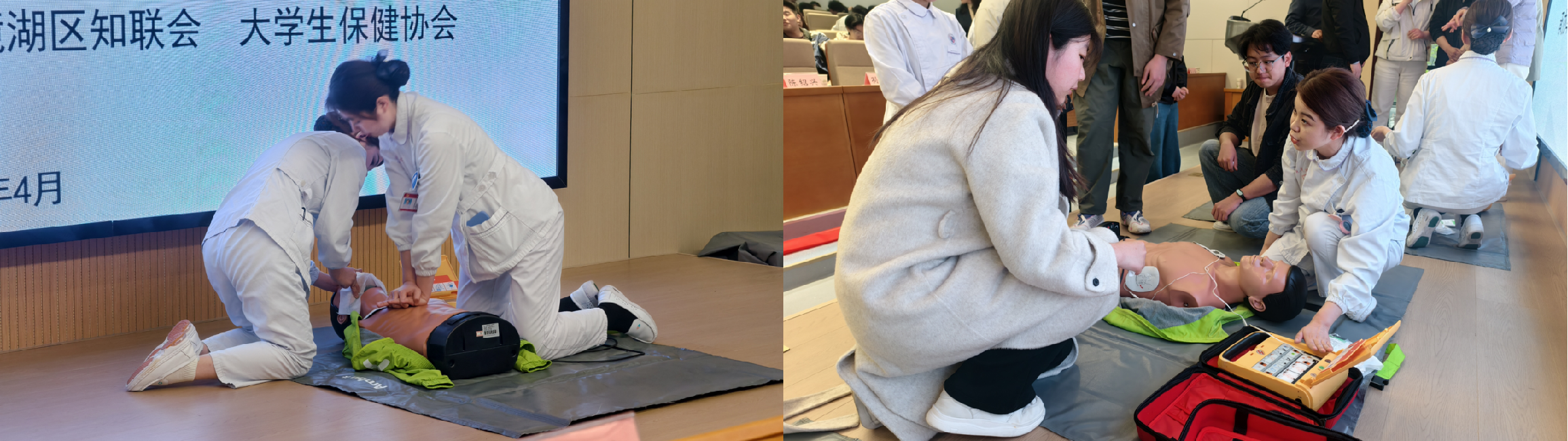 培训环节中,钱华俊以《生命的拥抱-海姆立克急救法》为题,讲解了气道异物梗阻的急救原理、适用场景与操作要点,并通过清晰的步骤演示,帮助师生精准掌握应急处置技巧。江波围绕《AED使用相关知识》展开分享,结合真实急救案例阐释了AED设备的工作原理、使用流程和注意事项,强调了“救命神器”在心脏骤停急救中的重要作用,让全体师生了解到“早识别、早呼救、早除颤”的黄金急救原则。王雅鑫、洪慧现场示范心肺复苏与AED联合急救的完整操作流程,细致讲解现场环境排查、伤者意识判断、规范胸外按压、设备开机、电极片粘贴、跟随设备语音操作等关键专业要点,补齐师生急救实操短板。演示结束后,参训人员分组开展实操练习,在医护专家的现场指导下,依次进行胸外按压和AED模拟操作。现场学习氛围浓厚,师生们积极提问、反复练习,在实践中巩固所学知识。