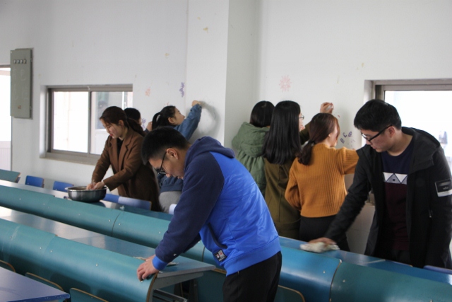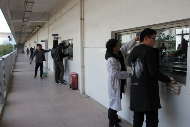 活动开始前,杨友谊对学生党员作了思想动员:一位党员就是一面旗帜,高校学生党员要做弘扬雷锋精神的领跑者。希望同学们要发扬雷锋精神,影响和带动周围同学,从身边从小事做起,多为他人、集体和社会做服务。接着,志愿者们随即分为两组,开始了对学院实验楼和行政楼进行清扫。擦玻璃、抹桌子、清除墙壁粘贴物、扫地拖地……参与活动的党员学生分工明确,互帮互助,通过清扫使学院实验楼和行政楼窗明几净、焕然一新。