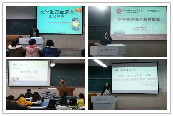 安全无小事,责任重于山。自11月中旬以来,学院党政领导高度重视学生冬季安全教育管理,多次组织召开专题会议,传达学校有关文件精神与要求,研究部署学院冬季宿舍用电、校园交通、网络信息等安全教育管理工作,制定《文学院2016年冬季安全教育活动方案》。各年级辅导员以学院实施方案为基础,谋划各班级宿舍安全教育活动,严格执行学校宿舍安全管理制度,为提升学生宿舍安全防范意识奠定了良好基础。