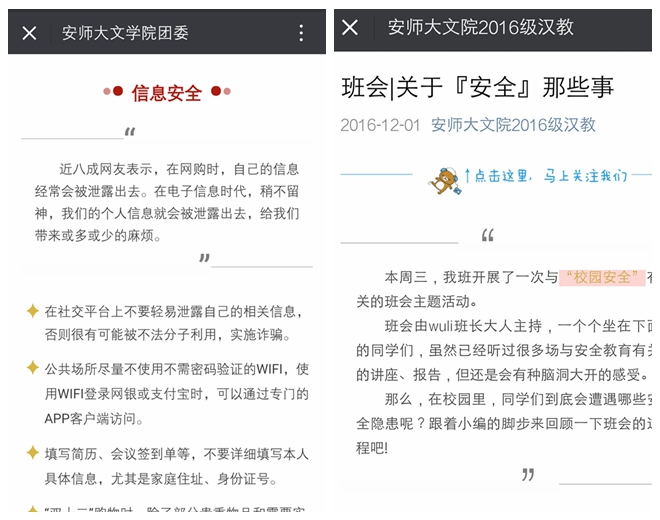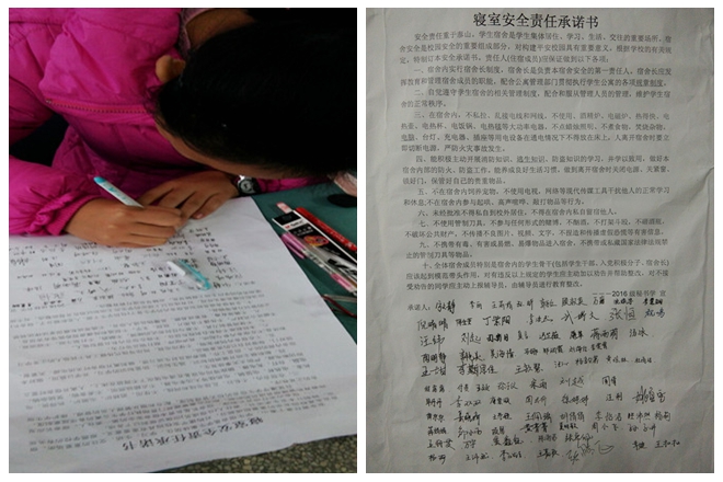 安全无小事,警钟要长鸣。学院各班级纷纷召开冬季宿舍安全教育班会,辅导员多次强调宿舍安全的重要性,要求学生自觉遵守学校“四项禁令”、安全用电等相关规定;组织学生签署《寝室安全责任承诺书》,许下郑重承诺,牢记安全忠告,居安思危,防患未然;2016级各班级开展以“安全用电,建和谐宿舍”为主题的寝室民主生活会,自由讨论,交换意见,自查自纠。学院学生会生活服务中心组织学生干部在常规寝室卫生安全检查的基础上,加强随机抽查与安全提醒;线上线下联动,文学院团委、各班级依托新媒体宣传平台,定期推送宿舍安全相关知识,加强安全教育宣传力度。