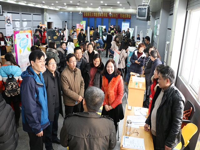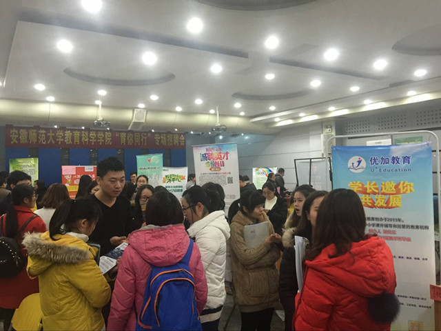 本网讯(教科院 马兴)你的未来,我们助航。为全力做好学生毕业就业工作,搭建毕业生与用人单位交流“直通车”,12月29日下午教科院举行了学院第三届“育你同行”专场招聘会。江苏学大教育、南京武家嘴实验学校、苏州博世堂教育培训中心、北京洪恩教育科技股份有限公司、滁州市信息工程学校、安师大幼教集团等来自省内外的近40家用人单位共提供就业岗位600余个,吸引了大批毕业生前来求职应聘。