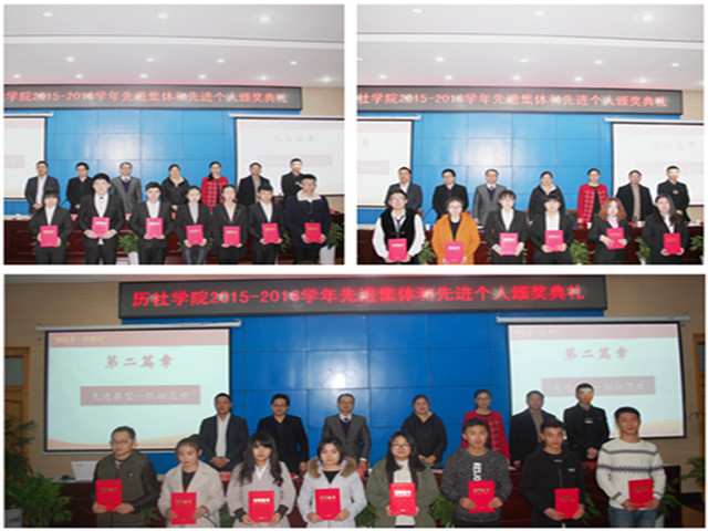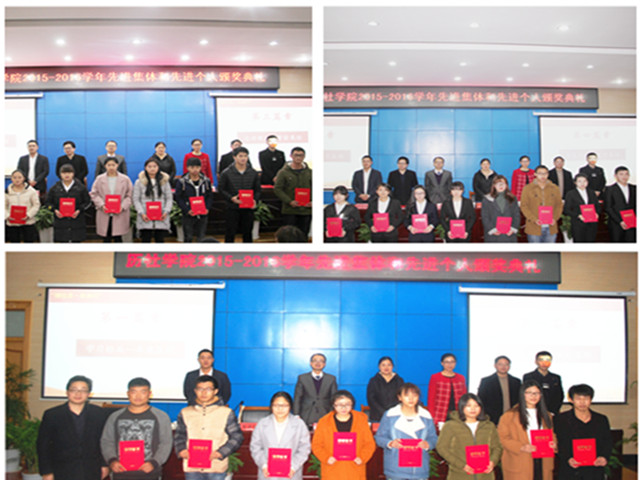 本网讯(历社学院 周贤超 崔哲明 张文逸)为营造“学先进、争先进”的良好学院氛围,表彰学院先进集体和先进个人,充分发挥他们的示范和引领作用,12月9日晚,历社学院在圆形报告厅二楼第三报告厅成功举办“继往志·壮来行”2015-2016学年学院先进集体和先进个人颁奖典礼。院党委副书记胡悦超,院团委书记宫超,16级辅导员杨静,13级辅导员王建辉,14级辅导员胡君,院学生会指导老师、16级辅导员周贤超,以及社团指导老师王雨兵应邀出席并为获奖同学颁奖。典礼由宫超老师主持,2016级本科生全体参加。
