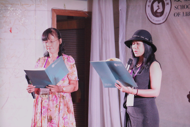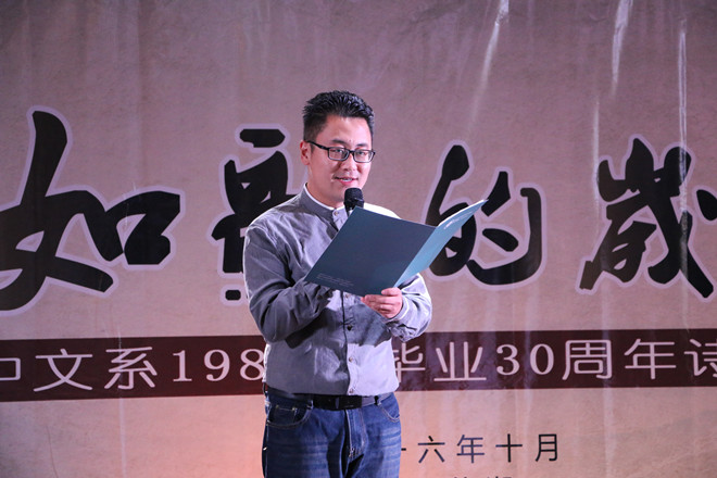 本网讯(文学院 魏鑫鑫 何涛)字字珠玑显同窗深情,抑扬顿挫咏岁月如歌。10月3日下午,文学院纪念中文系1986届毕业30周年“如歌的岁月”诗文朗诵会在花津校区团委多功能厅温情上演。校团委副书记刘长生,世界诗人、博士生导师杨四平教授,院党委书记余大芹,党委副书记戴和圣,院团委副书记杨穆龙,一百多位1982级校友及学生志愿者欢聚一堂,共同聆听此次诗文朗诵会。