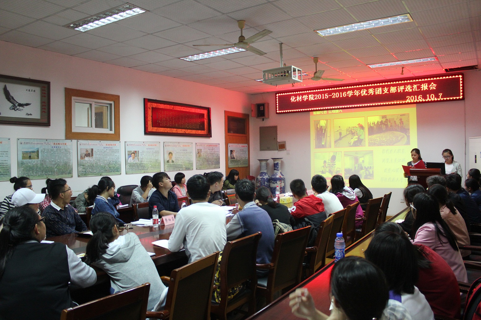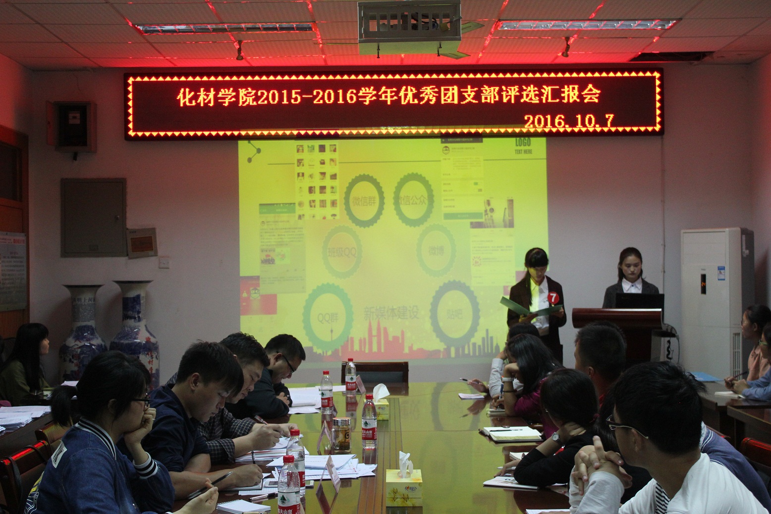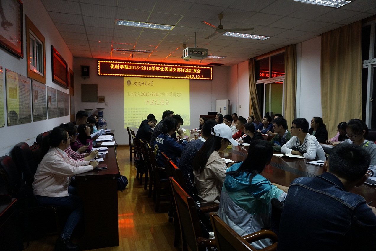 本网讯(化材学院团委 邹雯婷)为推进团的基层组织建设,加强团员意识教育,表彰先进,树立典型,10月7日,学院团委举行了2015-2016学年“优秀团支部”评比汇报会。学院团委蒋建伟老师、程紫丹老师、袁青兵老师、王国良老师和费白露老师任评委。各班级学生干部代表参加了评选汇报会。