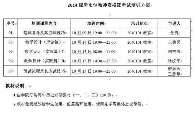 在副院长刘道胜教授的牵头指导下,学院专门制定了培训方案,邀请具有实战经验的金捷老师,历史学科教学论专家王德民副教授,中学一线教师刘宏法、徐汉平老师,担任过教师考试面试官的解光云教授、王彦章副教授举办专题讲座。