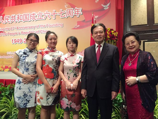 本网讯(文学院 张梦晗)2016年9月29日晚,中国驻泰王国大使馆于曼谷香格里拉酒店举行国庆招待会,隆重庆祝中华人民共和国成立67周年。多位泰国内阁部长和前政要,主要政党及政治团体代表,军、警高官,外国驻泰使节、华侨华人、中资机构、泰中媒体、汉语教师志愿者以及留学生代表等逾千人出席。文学院2015级及2016级汉语国际教育专业硕士研究生熊晓明和张梦晗作为优秀汉语教师志愿者代表受邀参加了此次招待会并认真聆听了中国驻泰王国特命全权大使宁赋魁热情洋溢的致辞。