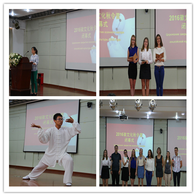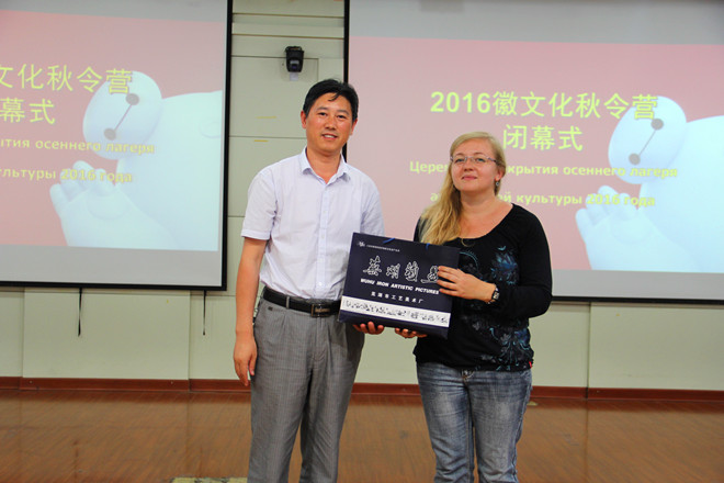 接着,中俄师生共同打造的小型文艺演出也正式拉开帷幕。作为东道主,中方学生为俄方师生带来了俄语流行歌曲、演唱了优美动听的中文音乐及演绎了刚柔并济的中华武术。俄方同学作为回赠,不仅演唱了中文歌曲《夜空中最亮的星》、吟诵了诗歌,还一起合唱了俄罗斯传统歌谣《喀秋莎》,赢得现场掌声连连。两校师生将中俄文化完美结合,为大家奉献了一场视听盛宴,充分展示了两校的友谊和文化传承。随后,中俄师生互赠礼物,他们将对彼此的感谢和祝福倾注于其中,虽离别,但友谊会永远长存。至此,安徽师范大学·俄罗斯米宁大学2016“徽文化”秋令营圆满落幕。