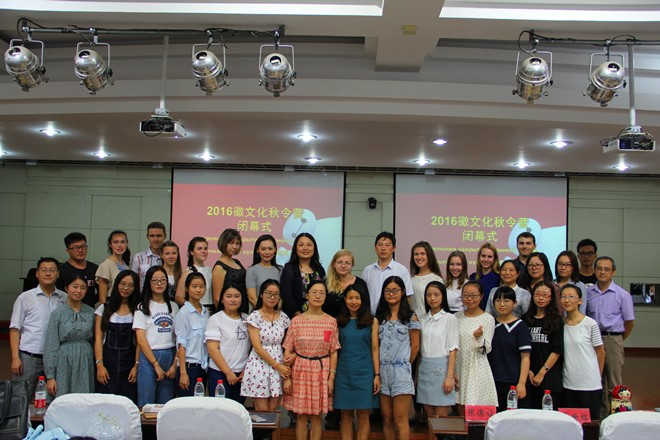 本网讯(文/王蕾 图/吴浩然 李一鸣)9月26日上午,安徽师范大学·俄罗斯米宁大学2016“徽文化”秋令营闭营式在外国语学院多功能厅隆重举行,标志着本次 “徽文化”春令营圆满落幕。外国语学院院长张德让、外事办副主任杜俊、外国语学院副院长吴世红、外国语学院党委副书记汪贻洋和俄语系主任耿丽萍出席闭营式。参加闭营式的还有俄罗斯秋令营代表团师生和俄语系全体师生。