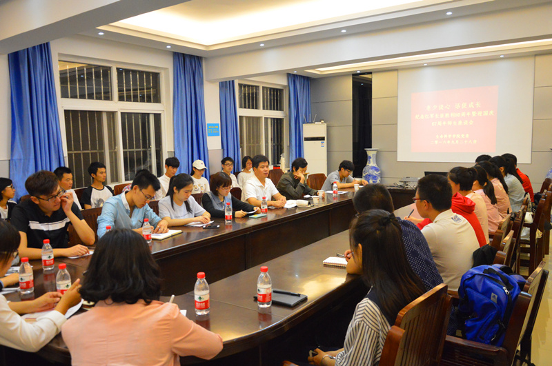 本网讯(生科院 张航 赵喆)忆往昔峥嵘岁月,瞻远景再创辉煌。9月28日晚上7点,生命科学学院第二会议室座无虚席,掌声阵阵,校关工委李沛儒老师激情澎湃地讲话把大家带回了新中国成立之前,那个波澜壮阔的革命时期。为纪念红军长征胜利80周年和中华人民共和国成立67周年,生命科学学院召开“老少谈心 话促成长”师生座谈会。学院党委书记蒋学波主持会议。学院团委书记赵喆,学生会、学生社团及各年级学生骨干代表40余人参加座谈会。