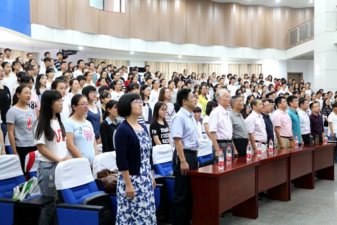 开学典礼在庄严的国歌声中拉开帷幕。文学院现当代文学专业王中教授首先作为教师代表致辞。在表达对2016级新同学的欢迎后,她希望同学们怀抱着梦想生活,带着对生活、对学术、对做人的初心去度过大学的四年。“让我们怀着一颗朝圣的心,尊师重教。青春是美好的,虽然也会遇到暴风雨,但是走过即是成功。心性、品德远比能力重要,品德是能力的翅膀,助你飞得更高。怀赤子之心,走成长之路。”她语重心长地对新生们寄语道。2014级卓越语文实验班高宜帆同学作为老生代表发言,她结合自己在大学学习与生活中的经历与感悟,建议新同学们要迎难而上,方得始终。2016级高云晖同学代表全体新生表态,要勤奋学习、严于律己,努力谱写大学生活的新篇章,做一个不负青春、不负年华的文院人。马鞍山二中特级教师盛庆丰作为校友代表致辞,他以自己在师大读书的经历为例,提醒同学们作为中文人要多读书,在读书的同时要有坚守和责任感。他强调道,“我们要把大学读书的四年融入到整个人生之中,因为读书产生的幸福感会与人们一直相伴相随”。