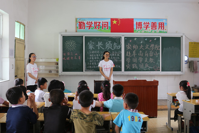 洪水的侵袭,连绵的大雨,给今年文学院所有前往偏远地区支教的实践团队带来了非常大的阻碍。但是文学院赴阜南国学支教团队却没有因为大雨而停止实践的脚步,只因为他们去年与孩子们的一个约定。7月7日,团队终于踏上旅程,冒雨前往安徽省阜阳市阜南县育蕾小学,开展为期15天的爱心支教活动。团队精心准备了13门传统文化课程,15名队员通力合作,在进行了5次增补删减后,编写印刷了十余万字的教案材料。《论语》的处世之道、古典故事的孝行之举、国学经文的象形之义……队员们用通俗易懂的故事汇、悦耳动听的诗经吟诵、古典优雅的汉舞教学,让孩子们打开了一个全新的世界。