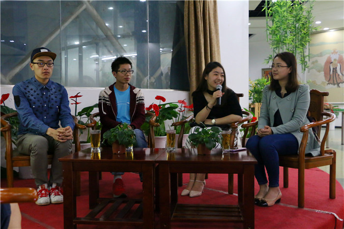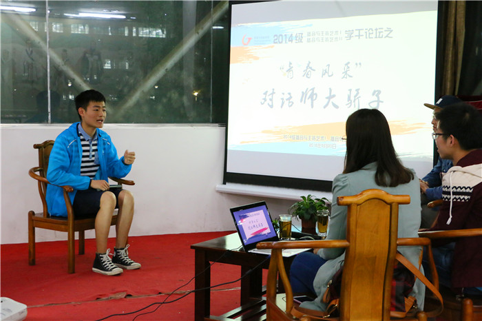 本网讯(新闻与传播学院)5月20日晚,新传学院2014级本科生党支部和班级联合开展的“学干论坛”之青春风采·对话师大骄子活动在敬文图书馆大益爱心茶室举行。本次活动是由2014级本科生党支部落实学院“两学一做”学习教育行动方案中关于“新传先锋”优秀党员风采事迹报告会的具体行动。本次活动邀请了学校“师大骄子”第十二届十佳大学生获得者2013级体育表演专业黄海洋、2012级社会学专业宋一墨、2013级自动化专业李改有和2012级播音与主持艺术专业余梦雅同学担任主讲嘉宾。
