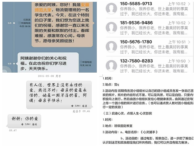 人们常说“母恩大于天”,世上最无私无悔的是母爱,为了在母亲节来临之际给于母亲最温暖的关怀,经管学院各班级纷纷参与了母亲节感恩行活动,运用短信等方式,一方面由班级将母亲节感恩的话语送给班里每位同学的妈妈,祝愿她们幸福安康,一方面又由每位同学自己于当天用自己最真挚的话温暖母亲的心。青春恰好,飞扬正当时,回忆过去一年中的悲欢喜乐,纪念班级成长中的点点滴滴,即将举办的“我爱我班,小组一家人”活动,是经管学院一些班级为了保留住记忆中的时光静好,特地组织班级小组分别拍摄一个十分钟左右的视频,形式不限,内容不限,其意义主要在于通过视频记录小组成员之间的欢乐相处,拉近彼此之间的距离,增强小组乃至班级成员之间的凝聚力,从而使班级成为一个更温馨、更和睦的大家庭。心灵为窗,启开它,为人生带来光明;照片为墙,渲染它,为生活增添美好。积极引导2015级新生通过“劳动周”活动,“劳”我所能,“动”我所得,在劳动中释放压力,收获快乐。在即将来临的“阳光心灵,美好生活照片展”活动中,各班级会组织同学每人拍一张照片组成照片展,这些照片可以是自我展示,可以是生活常态,也可以是自然风景等,活动不在乎拍摄的好坏,在乎的是能够展示学生们对生活的热爱,对美好幸福的追求,展现出经管学子不一样的风采。