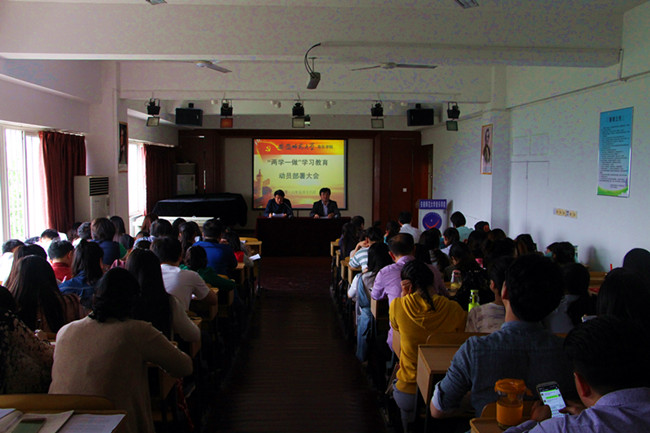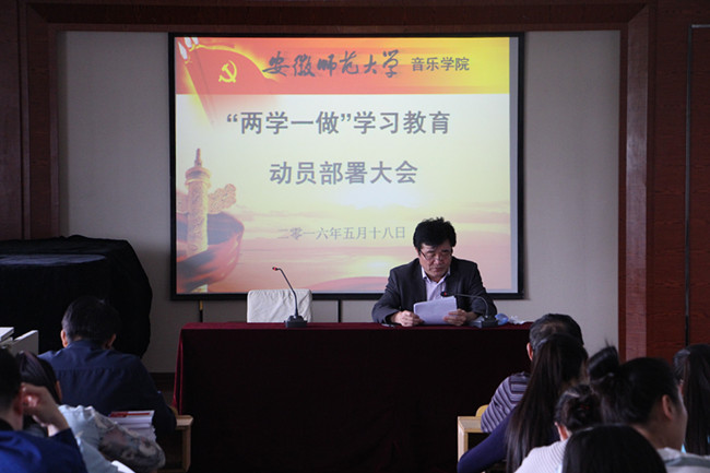 会上,王景旭书记首先传达学校 “两学一做” 学习教育的相关文件与精神,并带领大家学习了习近平总书记关于“两学一做”学习教育的重要指示和视察安徽时的重要讲话精神,细致解读了音乐学院“两学一做”学习教育方案。就教工党员和学生党员如何参与“两学一做”学习教育,分别做了详细的动员部署。并对“两学一做”学习教育意义和总体要求、学习教育的主要内容、学习教育工作的七个主要措施进行了细致的讲解。既要学习党章党规和系列讲话,又要解决可能存在的问题,争做合格党员。要围绕主题进行学习与讨论,创新方式讲好党课,定期召开专题组织生活会,集中开展党员民主评议,抓住问题及时整改,立足岗位亮身份当先锋,同时党员干部要率先作出榜样。