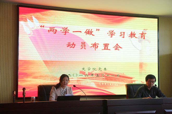 本网讯(文学院 余红梅)5  11 下午,文学院党委在院三楼报告厅召开“两学一做”学习教育动员布置会。学院教工党员和学生党员近两百人到场参会,动员布置会由院党委宣传委员、副院长王昊主持。