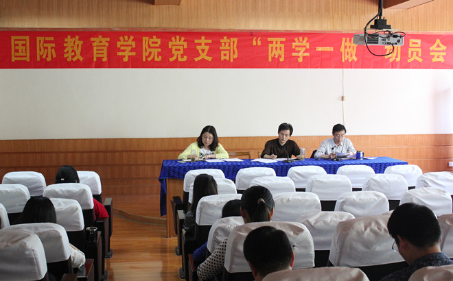 本网讯(国际教育学院 张银丹) 54下午,国际教育学院党支部召开“两学一做”动员会,国际教育学院院长、外事办公室主任黄圣炯,国际教育学院副院长、外事办公室副主任刘东合,国际教育学院副院长、外事办公室副主任杜俊,院教学主任许凌虹及学院全体教师党员出席。