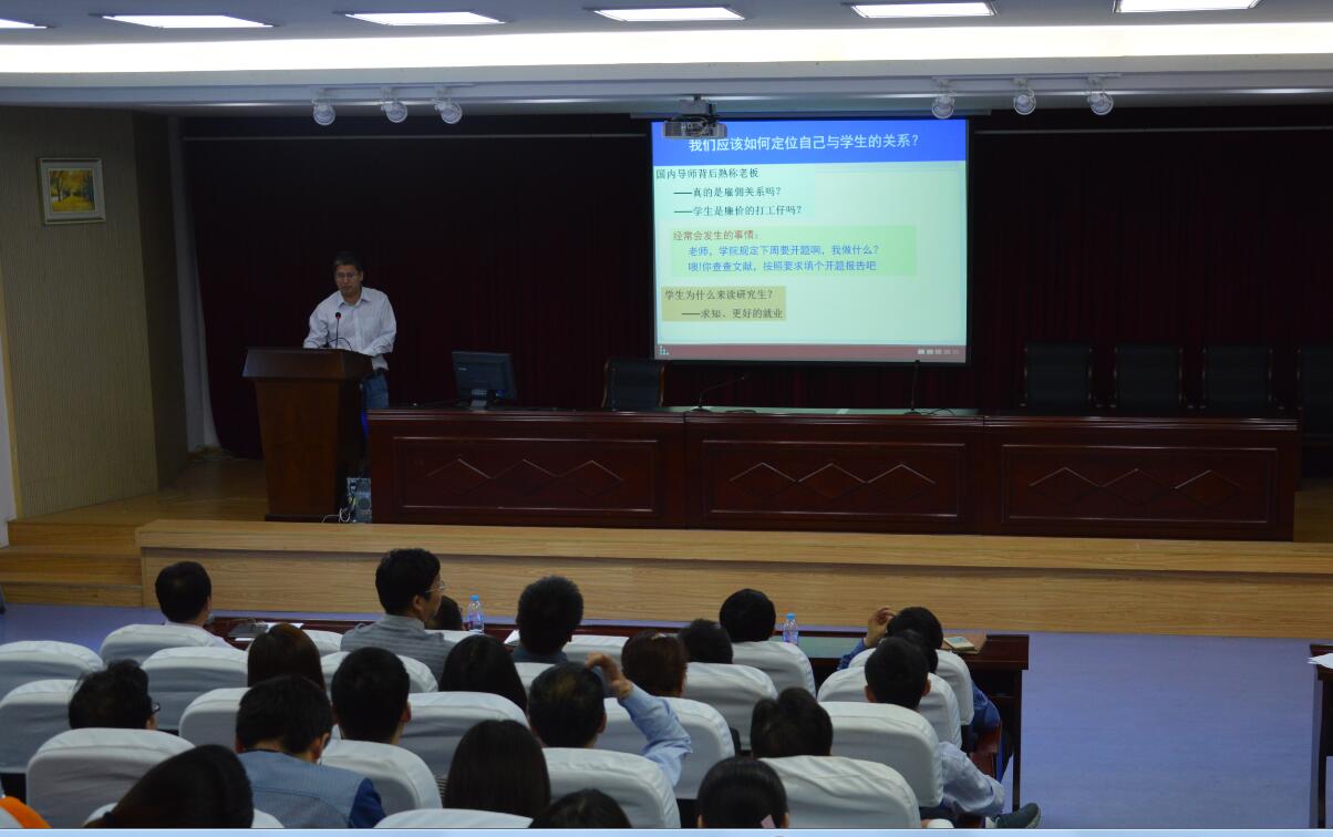 商永嘉教授通过分析我校特别是生科院研究生教育发展情况,肯定了研究生教育的良好发展态势,通过解读国家部委关于深化研究生教育改革的意见、刘延东同志的重要讲话以及我校研究生教育管理体制。商永嘉教授强调,研究生教育,导师是第一责任人,必须通过改革评价机制、提高教学指导能力、强化师德师风建设抓好导师队伍建设;导师不是荣誉,更非水平身份的象征,而是一个岗位、一份责任和义务。