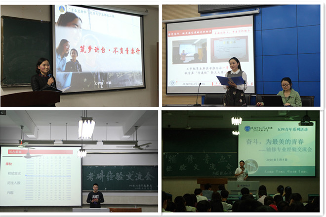 榜样引领,共话成长历程。文学院众多优秀学子每年都会走上讲台,与同学们分享他们的成长经历。十佳大学生评比汇报会、“自强之星”评比汇报会、考研经验交流会、辅修经验交流会等活动的顺利开展,让学院青年学子展示出别样的青春风采,他们用行动实现人生蜕变,更以这种蜕变为文学院学子树立榜样,引领青年大学生共同追寻理想人生。