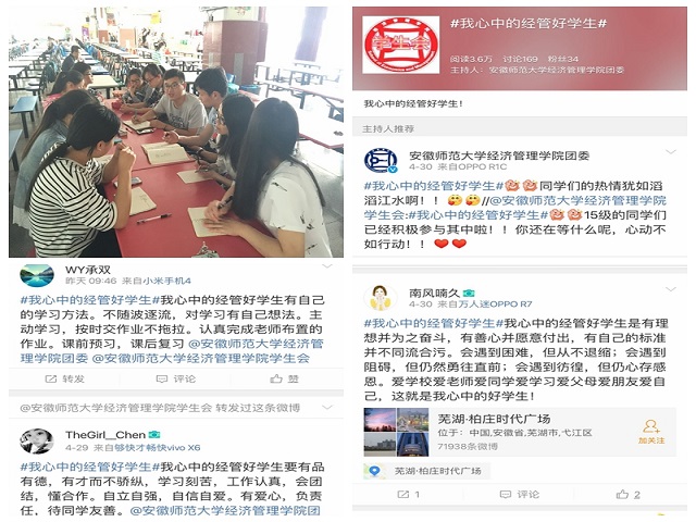 经济管理学院高度重视教育思想观念大讨论活动,自3月17日的“专家论坛”开始,学院陆续邀请了海内外的专家同我院老师进行教育思想的交流,制定了《经济管理学院本科生教育思想观念大讨论工作实施方案》,在14、15级各专业、学生会各部门以及社团中通过微博话题参与、召开座谈会积极讨论等线上线下相结合的方式先后从学院建设、教师层面、学生层面等就“好课堂”、“好学生”、“好学院”、“好大学”进行了交流和讨论。经济管理学院依照学校工作要求,坚持“统筹规划、突出重点、强化基础、整体提高”的思路,紧紧围绕人才培养的整体定位与规格要求问题、制度设计和资源配置问题、学院治理结构和建设举措问题以及好学生、好老师、好课堂和好大学的衡量标准问题等主题,采取从上到下、从下到上、上下联动的方式,以最终达到形成教育思想观念的共识,并且内化于师生的目的,学院将进一步固化讨论成果,推动实力经管、特色经管、魅力经管发展。
