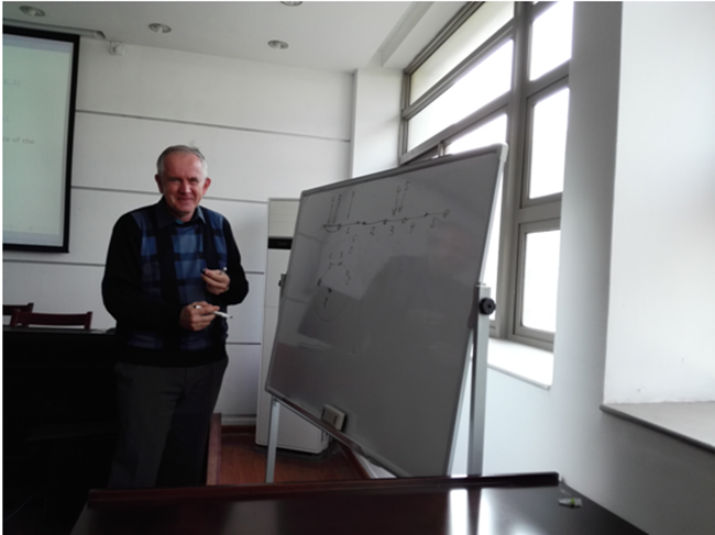 425日至 53期间,Vatutin教授为我院师生讲授了题为“Branching processes and their applications(分枝过程及其应用)的短课。此次国际专家短课由8节课组成,分4个讲座进行。我院部分教师、研究生、本科生参加了Vatutin教授的短课。Vatutin教授风趣幽默,短课信息量大,深入浅出,听取讲座的师生均表示获益匪浅。他从中国各朝代的变迁、物种的演化、疾病的传播、DNA的复制、基因的突变等方面入手,介绍了分枝过程的背景和应用。他从分枝过程的定义开始说起,由浅入深,讲授了“Reduced Process(缩减过程)”“Polling system(轮询系统)” “Multitype branching processes in random environment (随机环境中多物种分枝过程)”等前沿问题。
