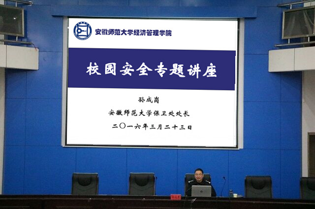 本网讯(经管学院新闻部)为加强经管学院学生的安全教育与管理,提高学生的安全防范意识,3月23日下午两点校保卫处处长孙成岗应邀为经济管理学院师生作了一场以“防范在心中,安全在身边”为主题的校园安全报告会。报告会由经管学院党委副书记李海燕主持。